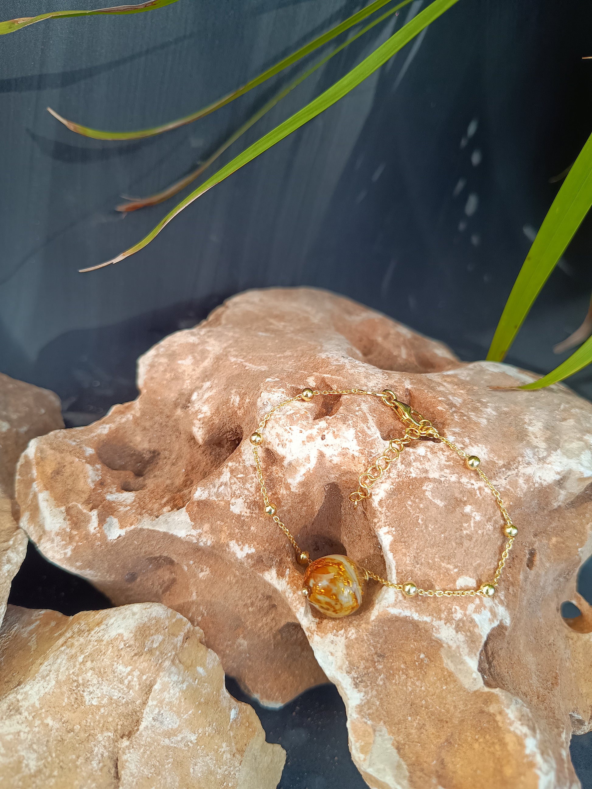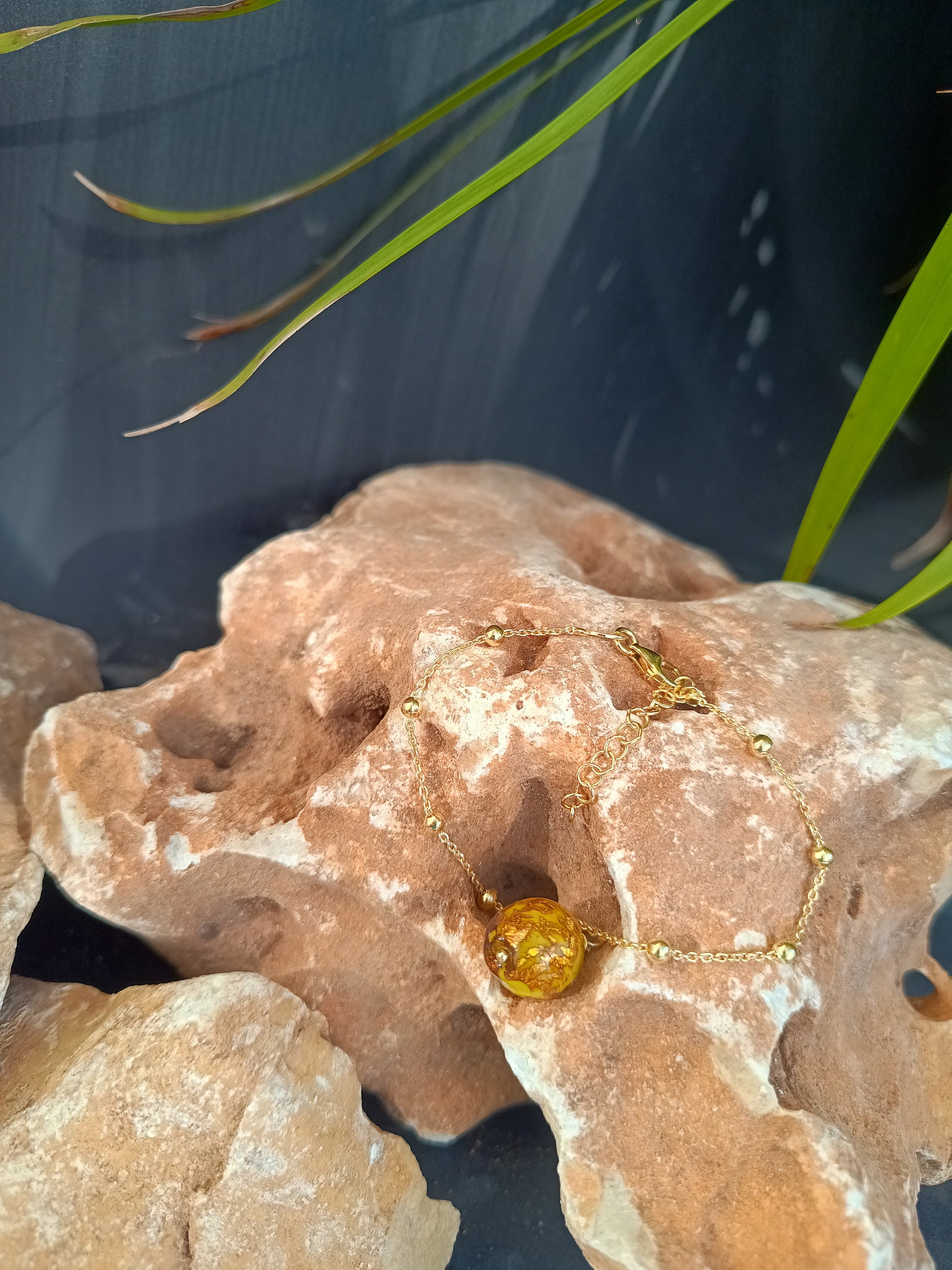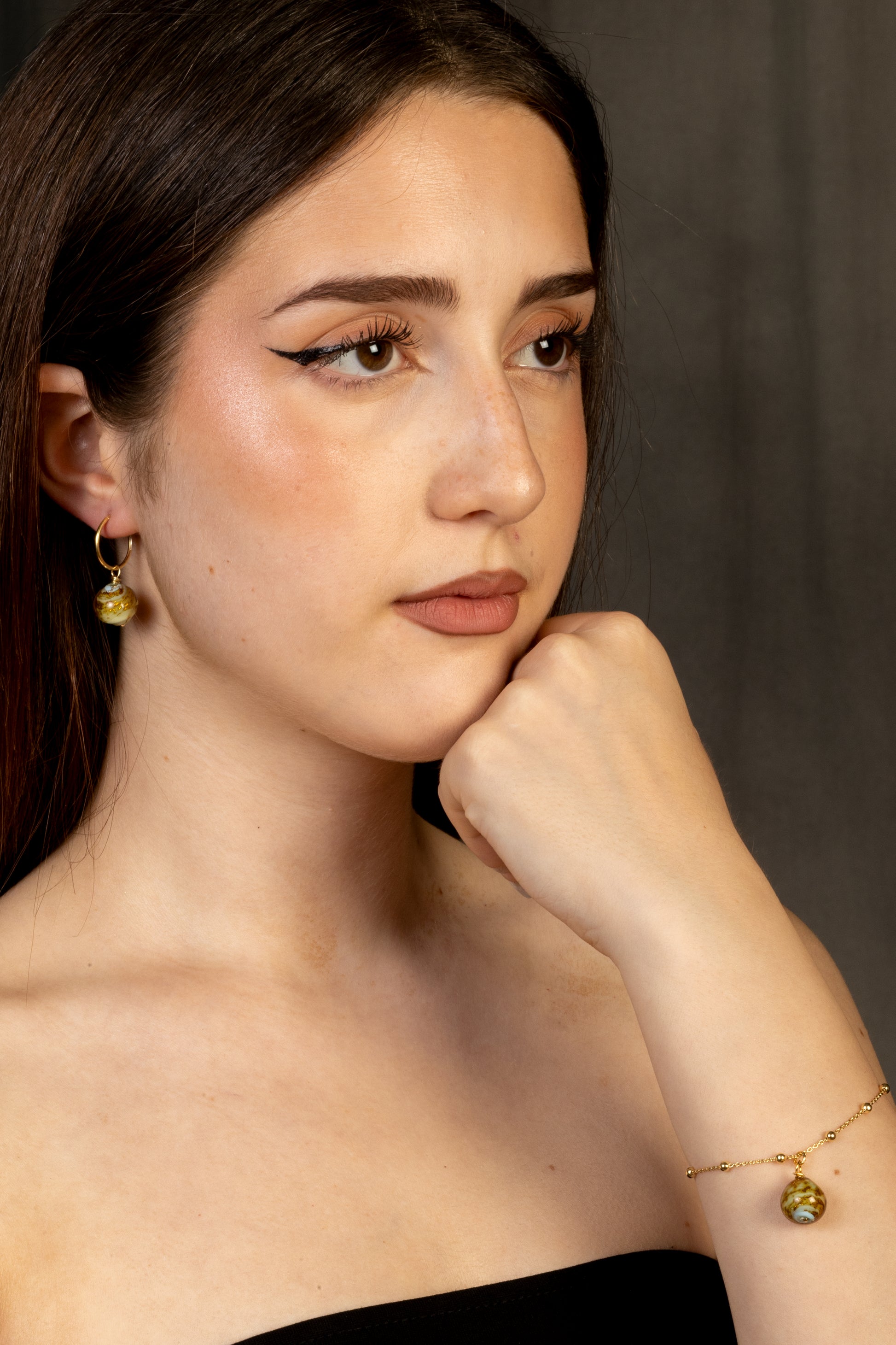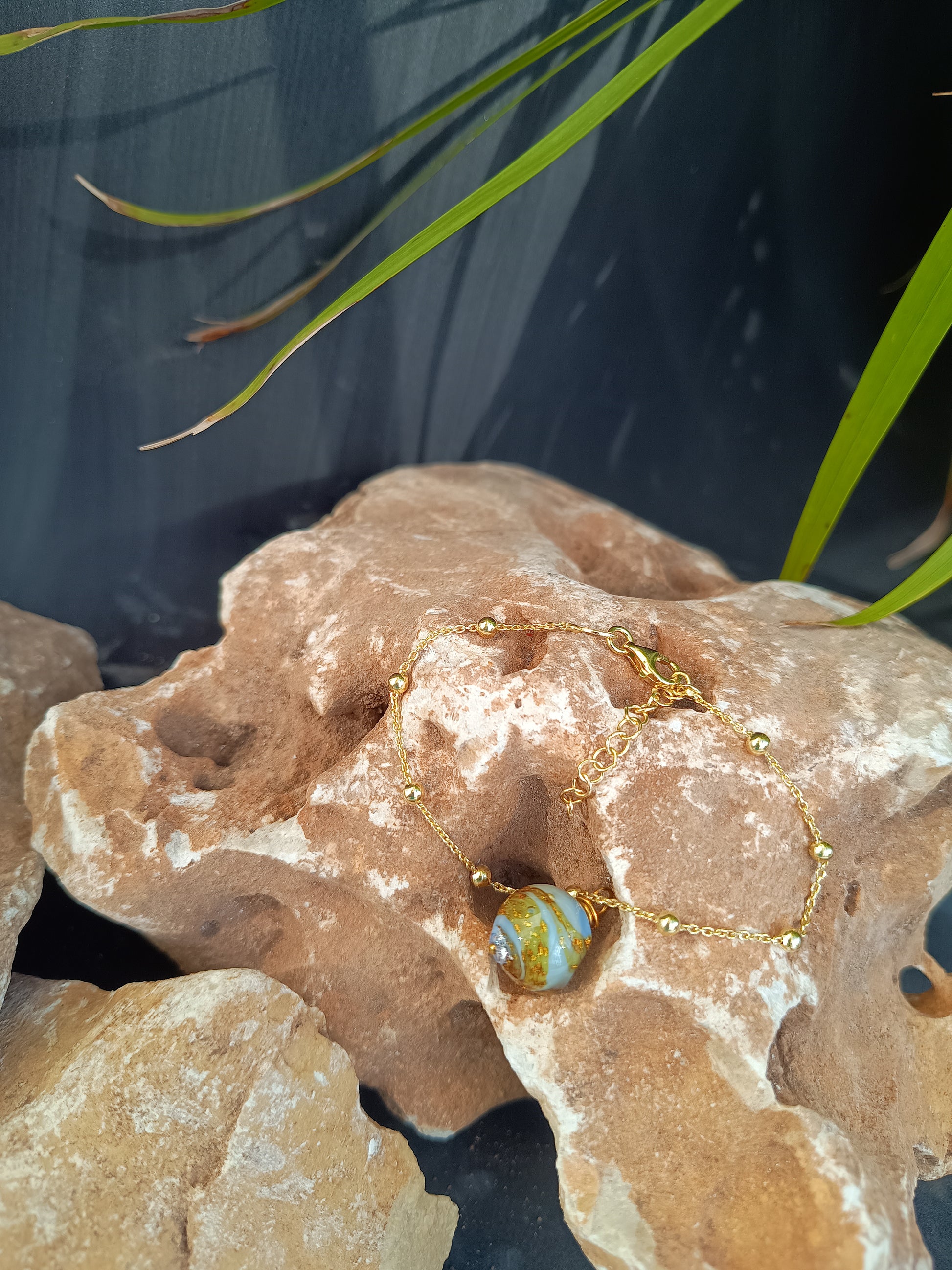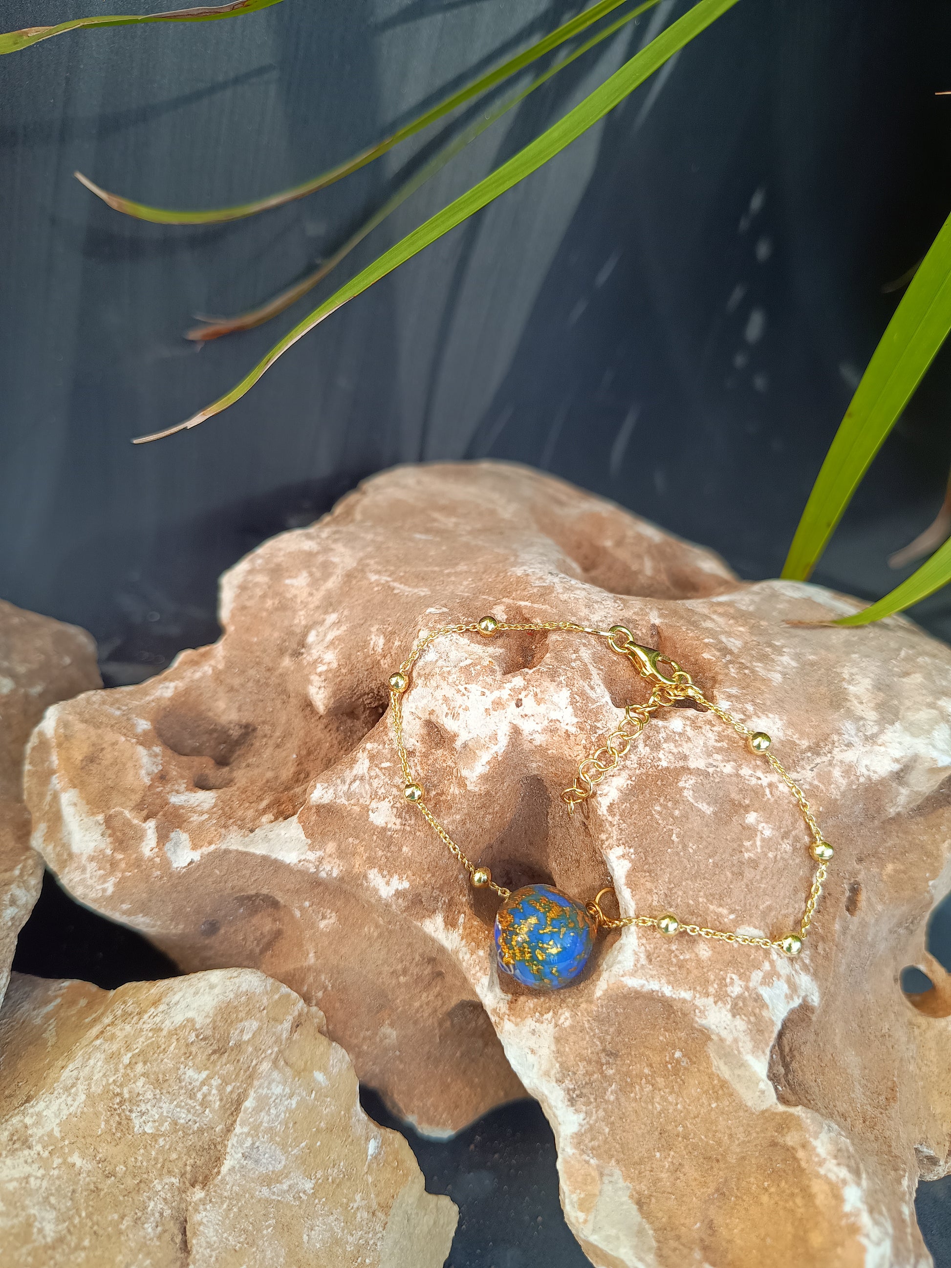 La perla planets è in vetro soffiato con scaglie in oro 24kt. La perla è realizzata con la lavorazione “vetro sommerso” questa particolare tecnica di lavorazione permette di conservare, inalterate nel tempo, le scaglie d’oro 24kt mantenendole per sempre rinchiuse nella perla.