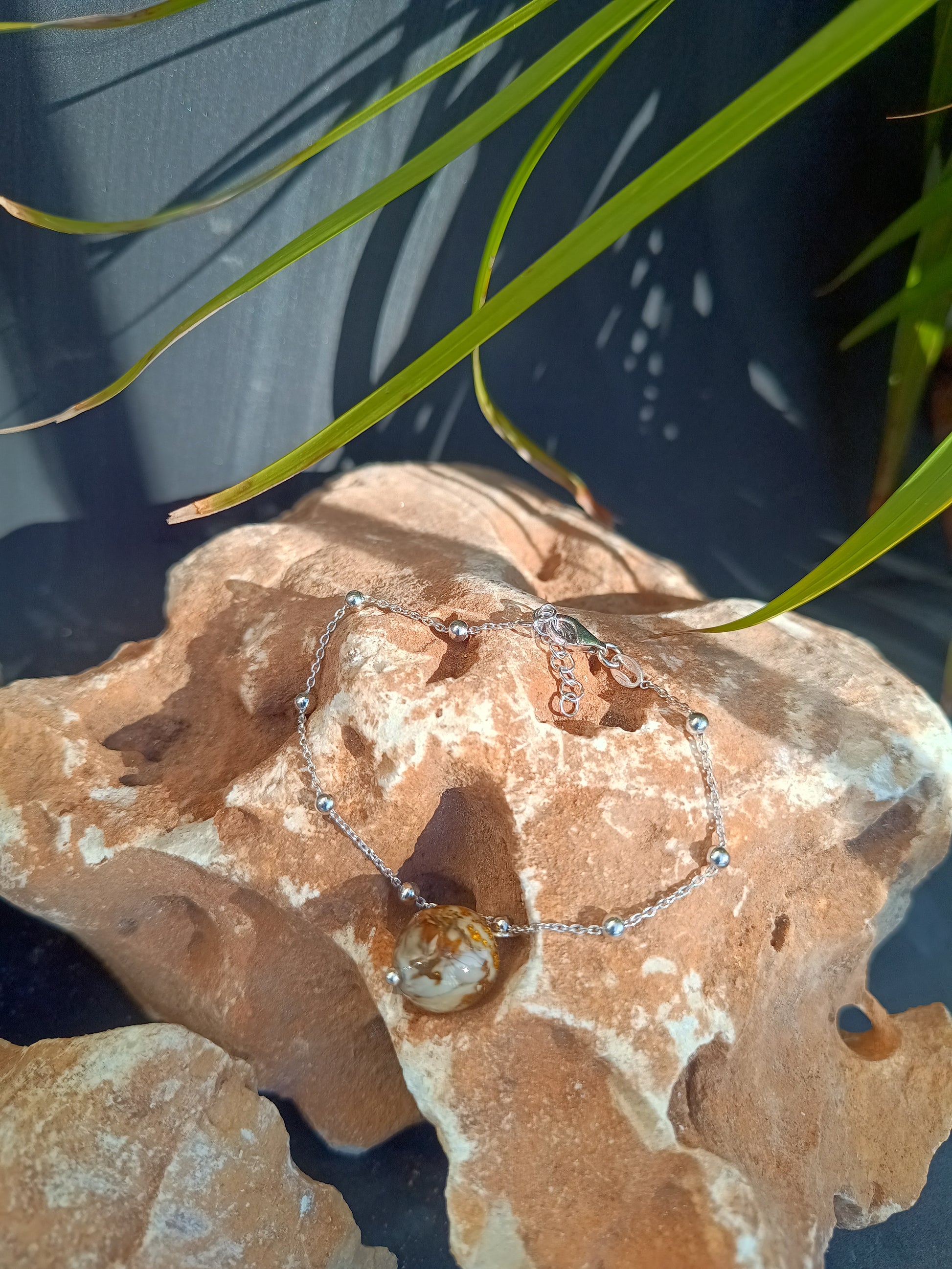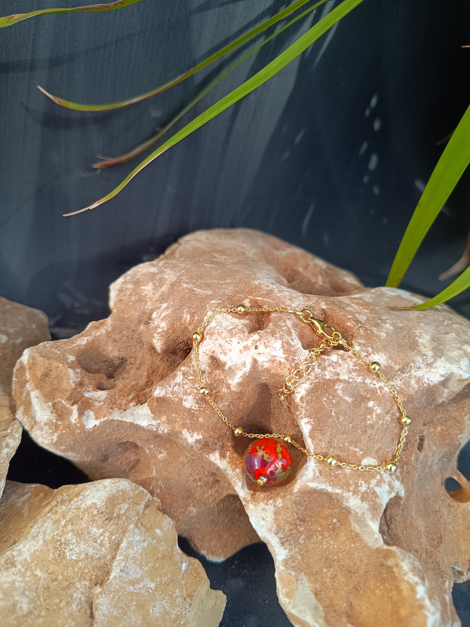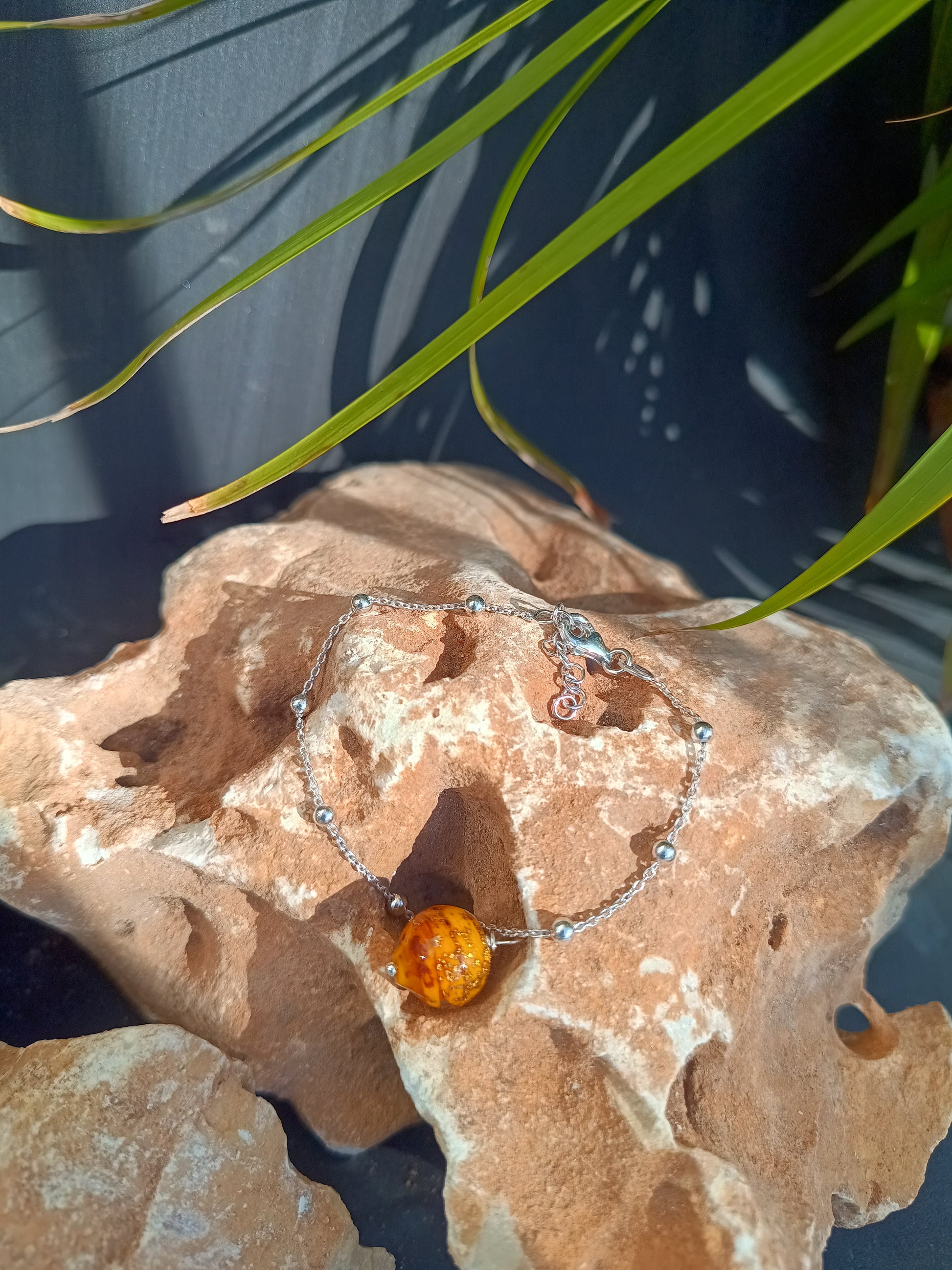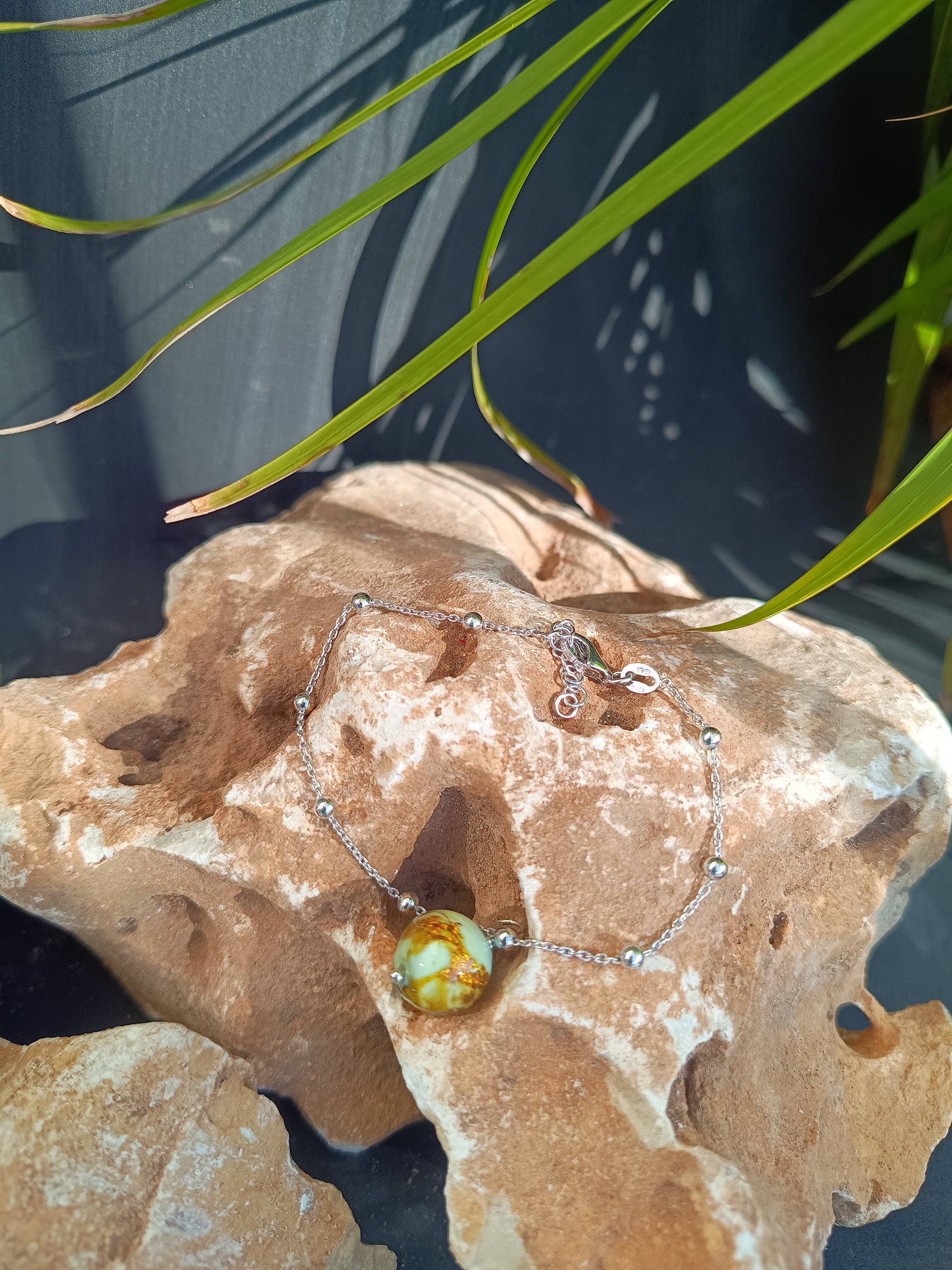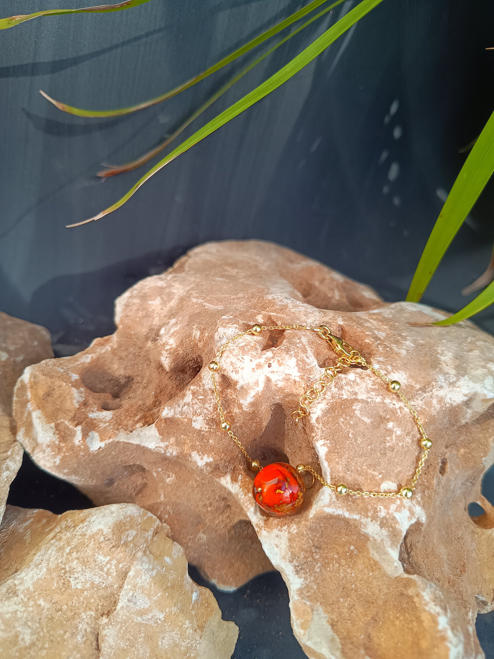 La perla planets è in vetro soffiato con scaglie in oro 24kt. La perla è realizzata con la lavorazione “vetro sommerso” questa particolare tecnica di lavorazione permette di conservare, inalterate nel tempo, le scaglie d’oro 24kt mantenendole per sempre rinchiuse nella perla.