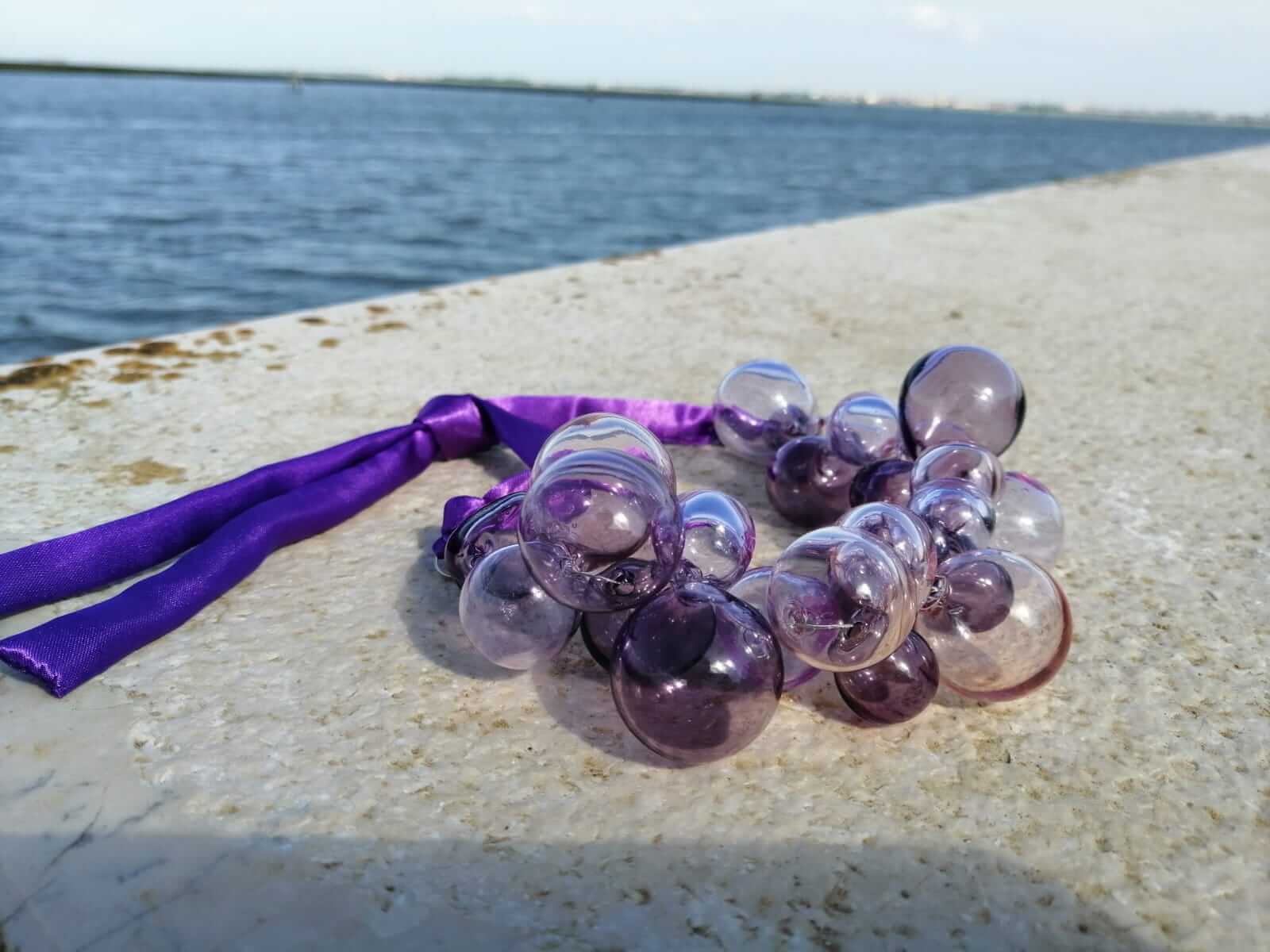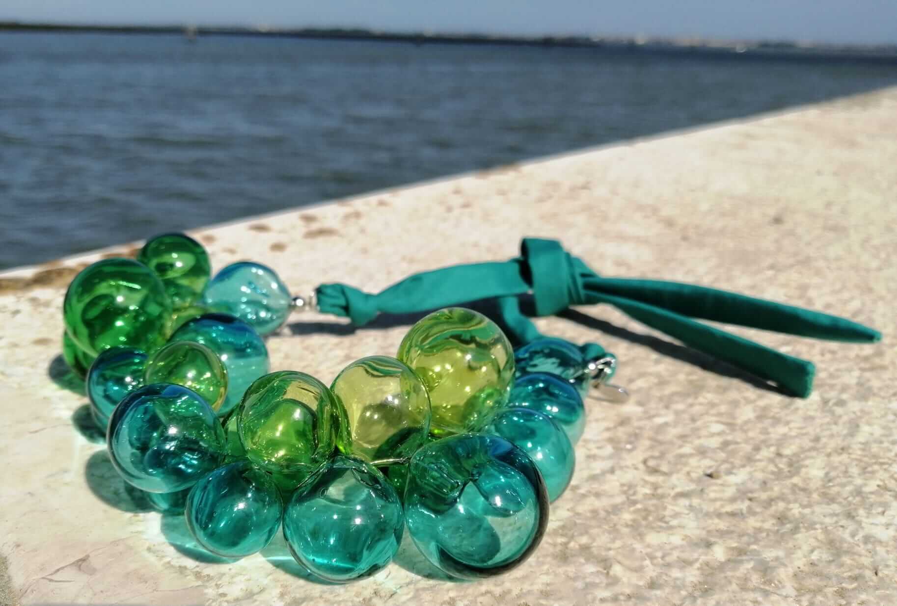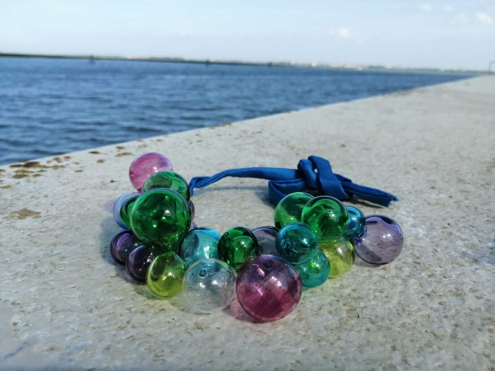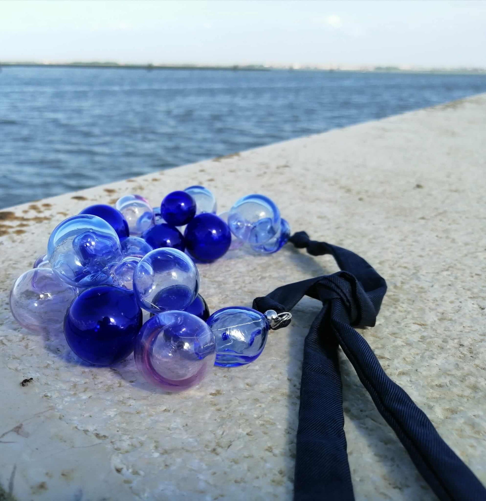 Questa splendida collana di perle di vetro soffiato trasparente, realizzata a mano, ti farà brillare in ogni occasione. I colori bellissimi e il cordino in raso la rendono unica e raffinata. Artigianalmente lavorata a mano con perle di vetro di Murano, la tua collana Bolle di sapone sarà un elegante complemento a qualsiasi outfit.