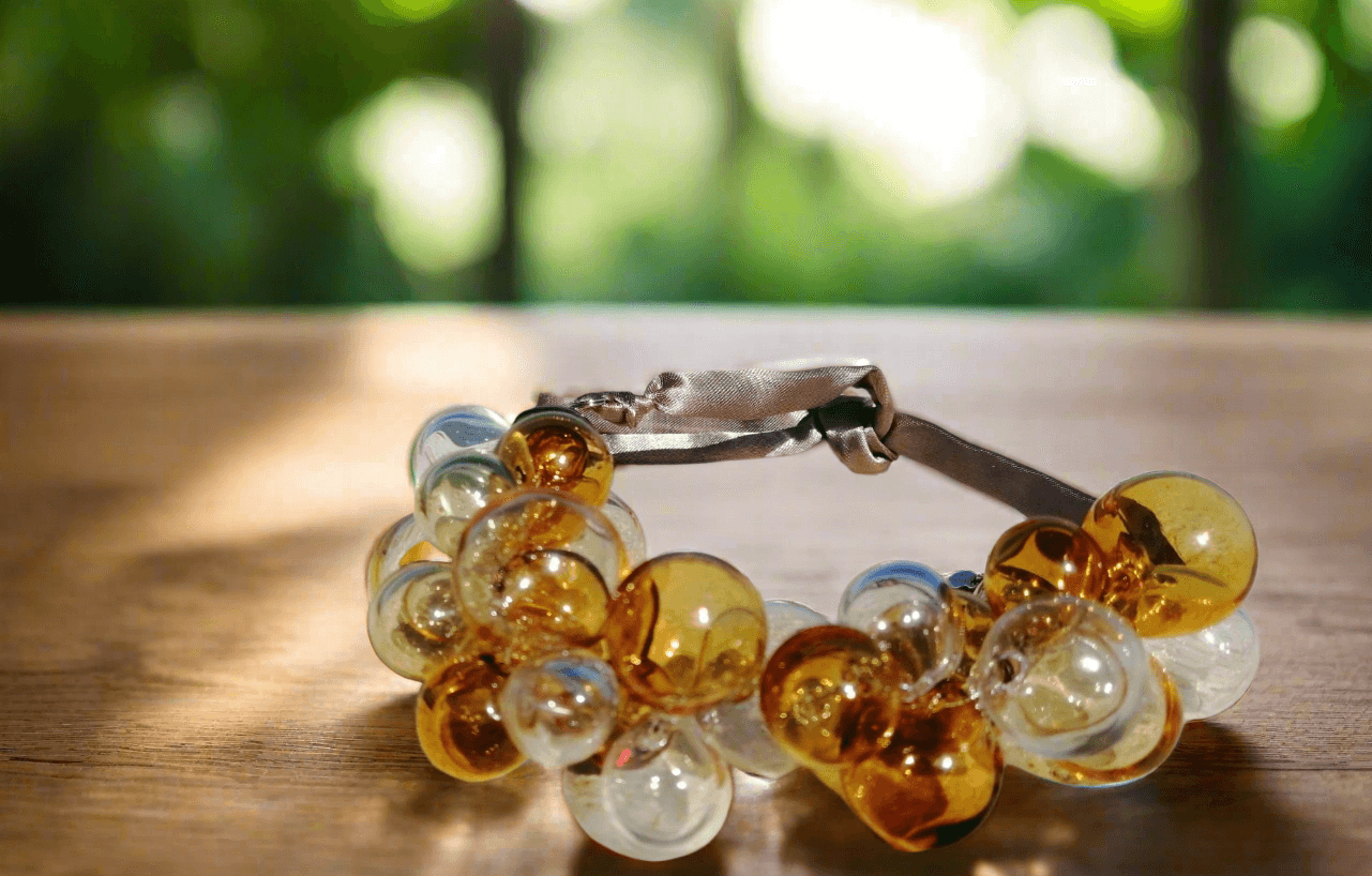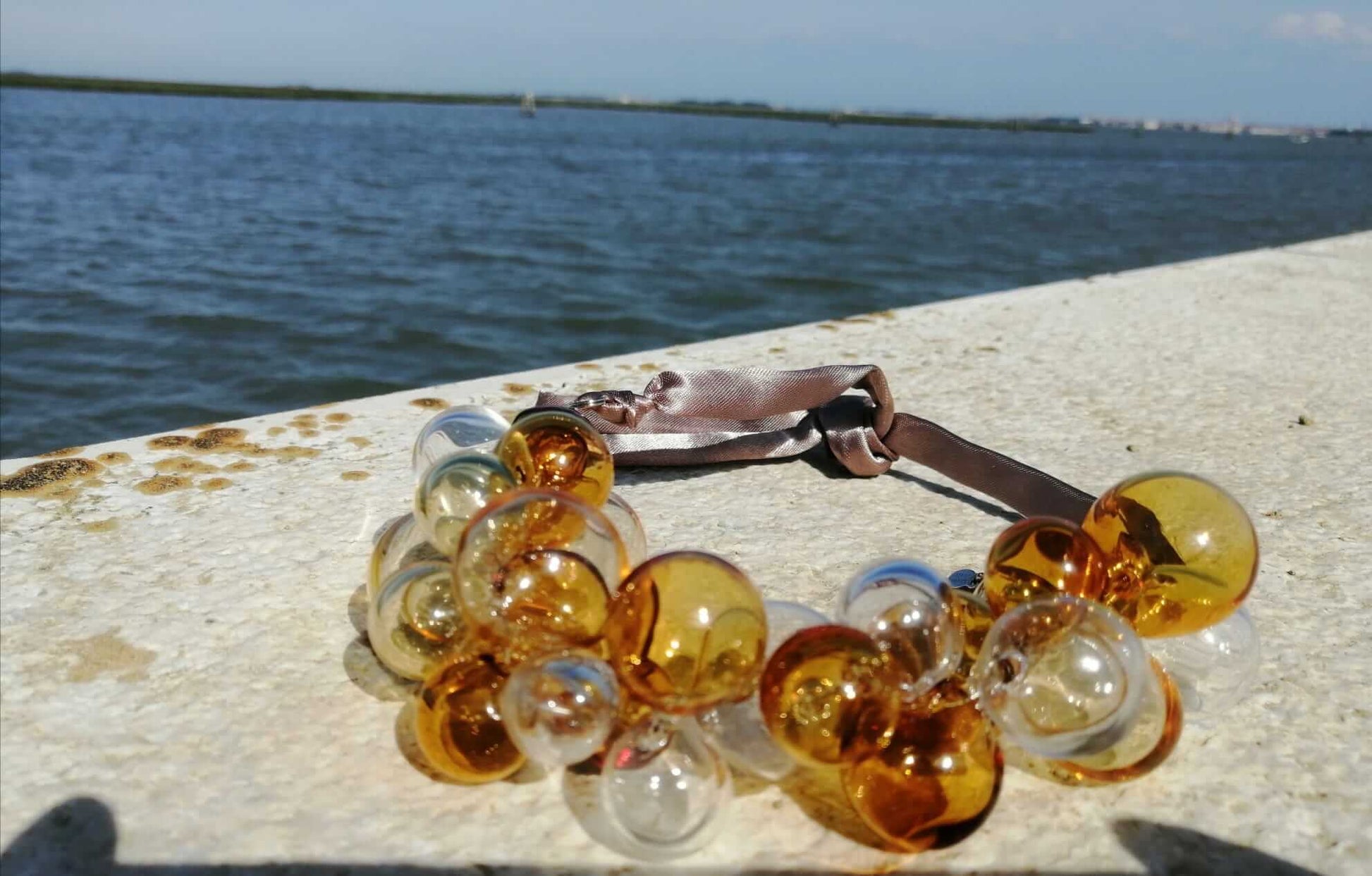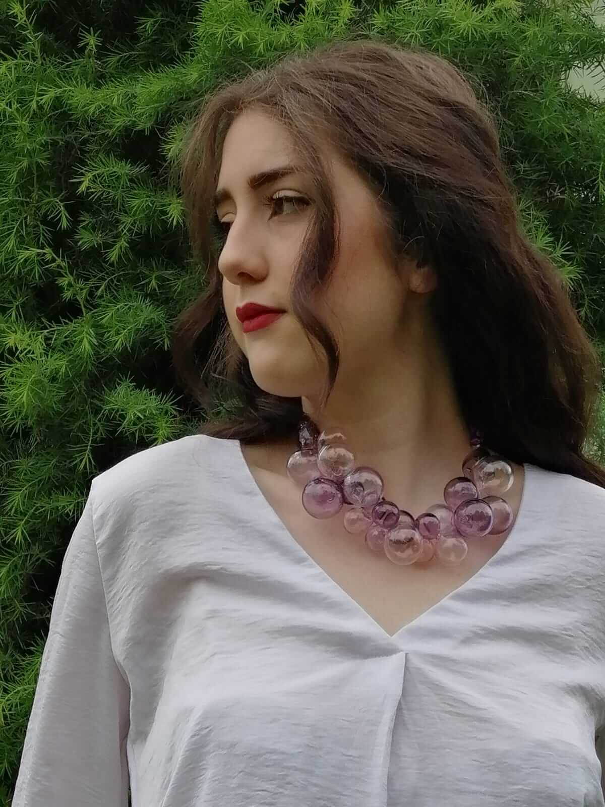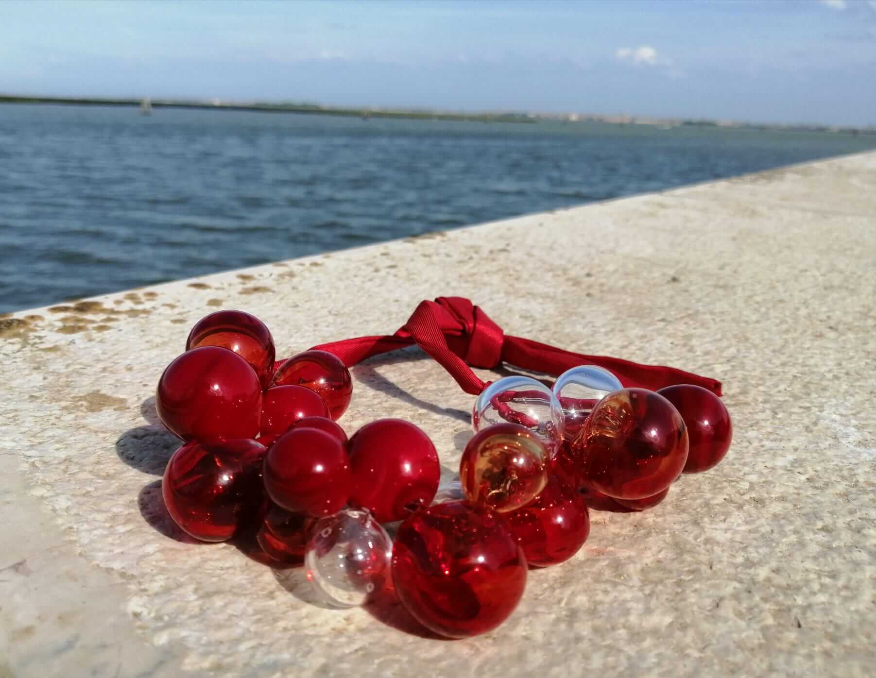 Questa splendida collana di perle di vetro soffiato trasparente, realizzata a mano, ti farà brillare in ogni occasione. I colori bellissimi e il cordino in raso la rendono unica e raffinata. Artigianalmente lavorata a mano con perle di vetro di Murano, la tua collana Bolle di sapone sarà un elegante complemento a qualsiasi outfit.