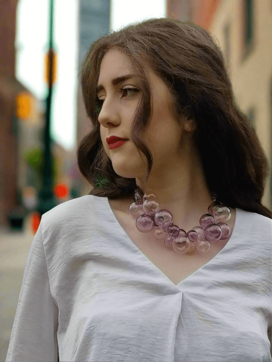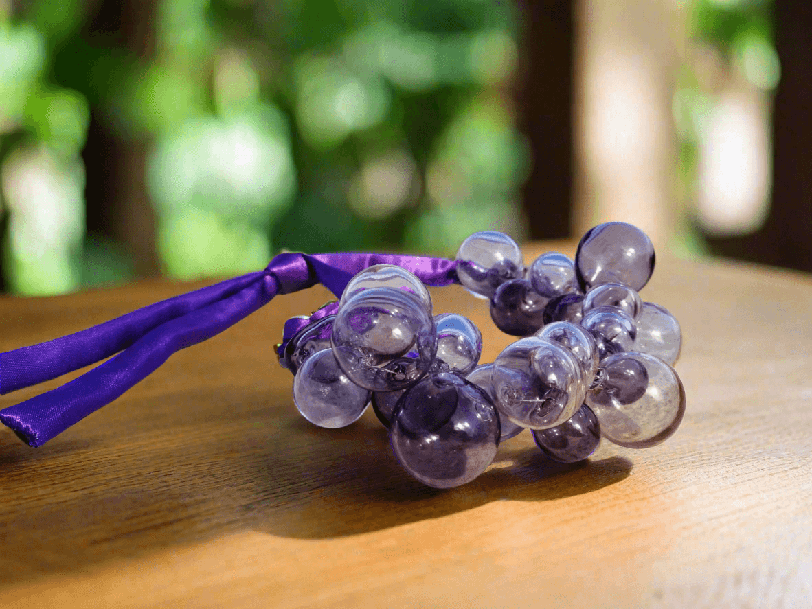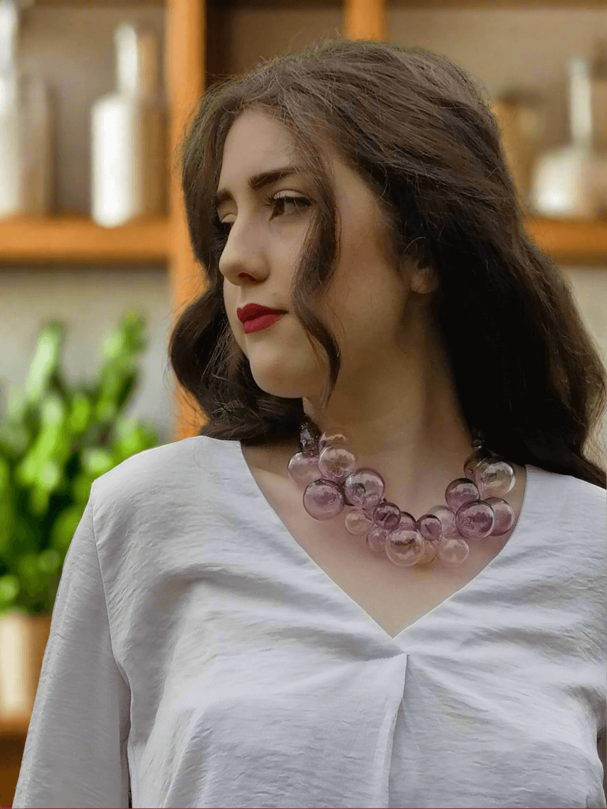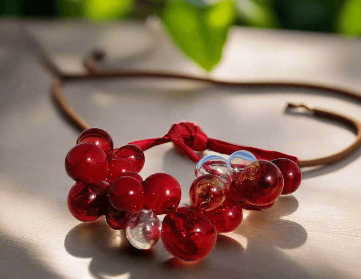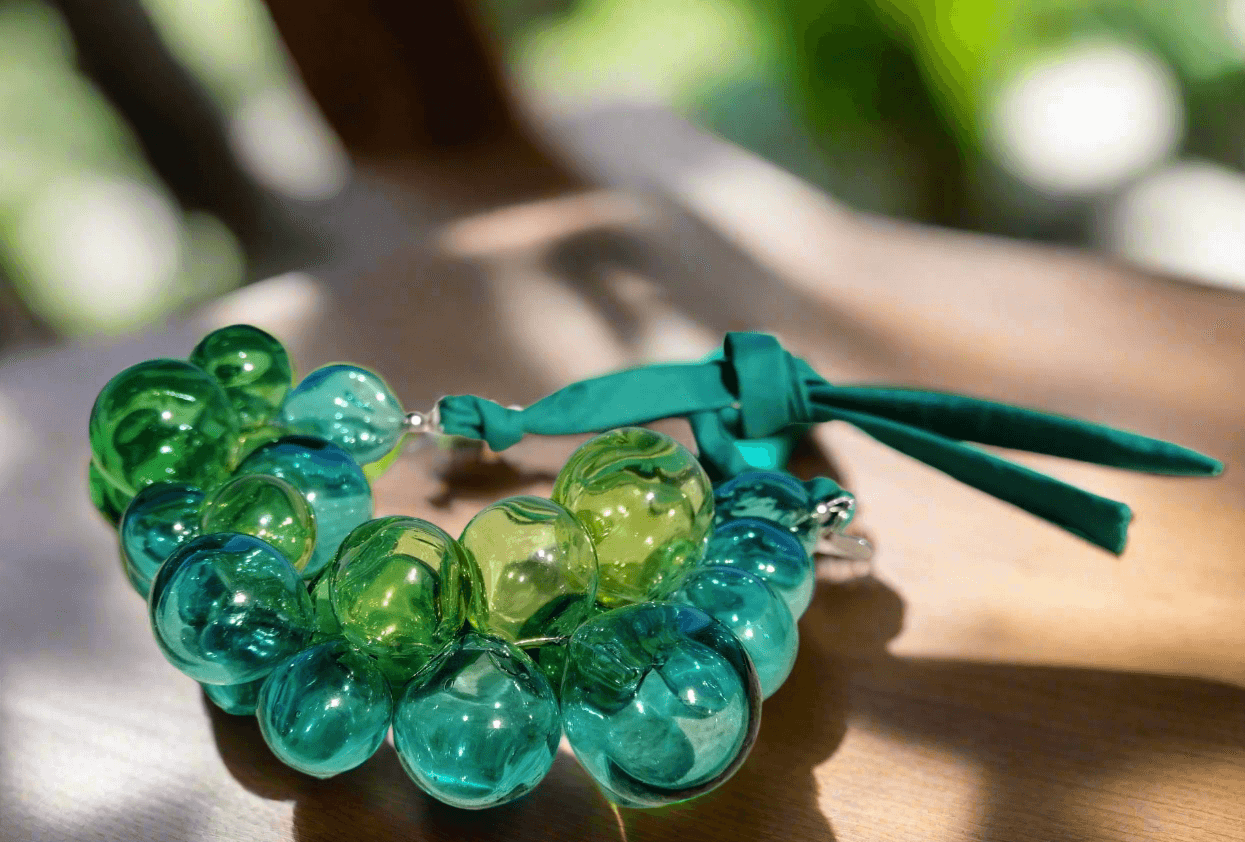 Questa splendida collana di perle di vetro soffiato trasparente, realizzata a mano, ti farà brillare in ogni occasione. I colori bellissimi e il cordino in raso la rendono unica e raffinata. Artigianalmente lavorata a mano con perle di vetro di Murano, la tua collana Bolle di sapone sarà un elegante complemento a qualsiasi outfit.