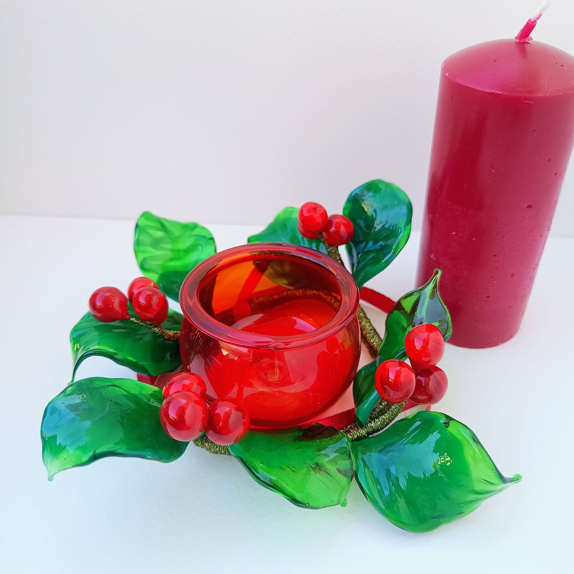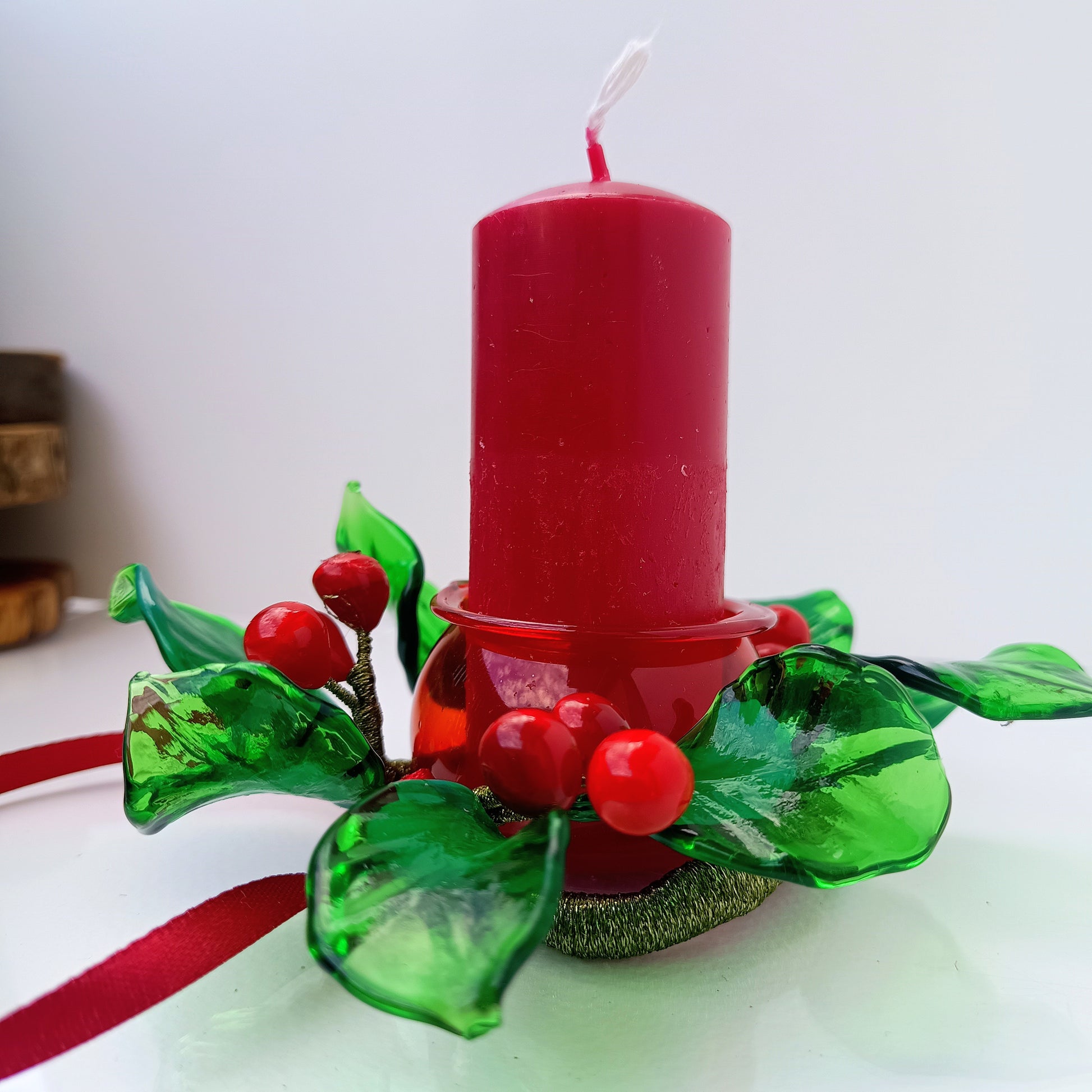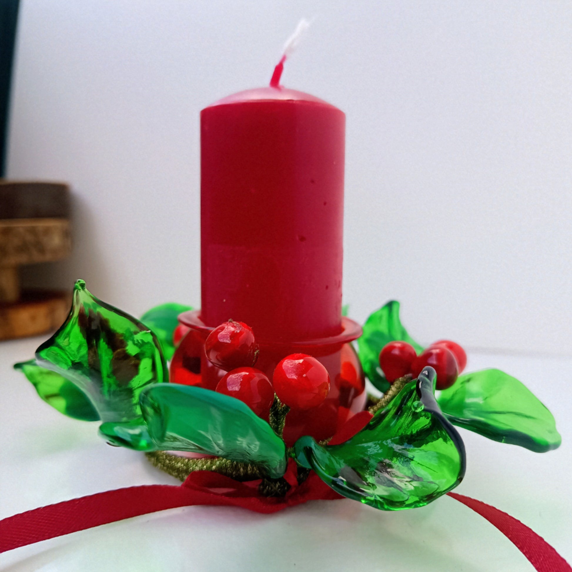 Goditi l'atmosfera natalizia con il Centrotavola Agrifoglio! Realizzato con foglie e palline in vetro, al centro della composizione è inserito un piccolo vasetto in vetro soffiato rosso trasparente dove potrai mettere una deliziosa candela profumata, questo elegante centrotavola di Murano renderà le tue occasioni speciali indimenticabili. Regala una sorpresa ai tuoi ospiti con un tocco unico sulla tua tavola!