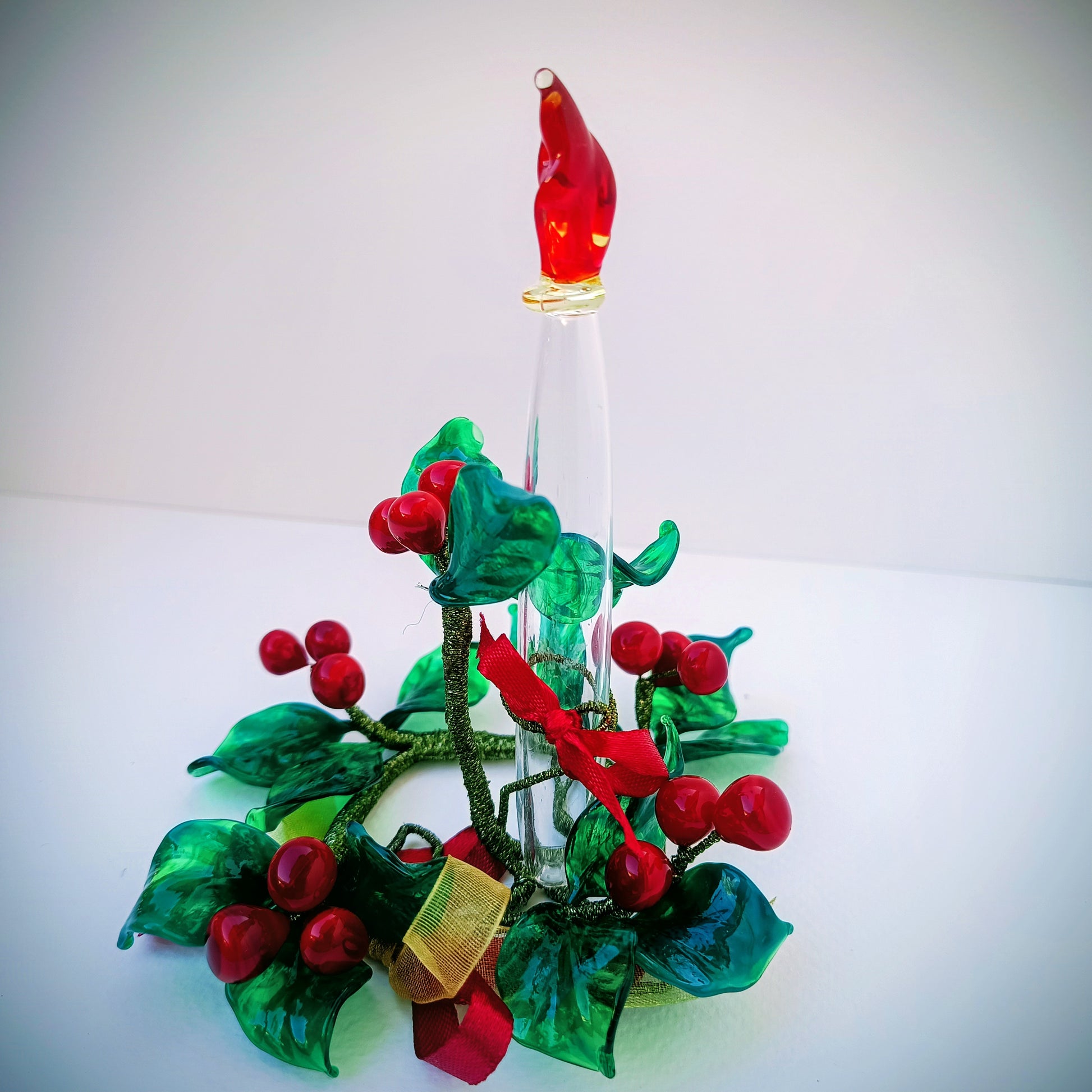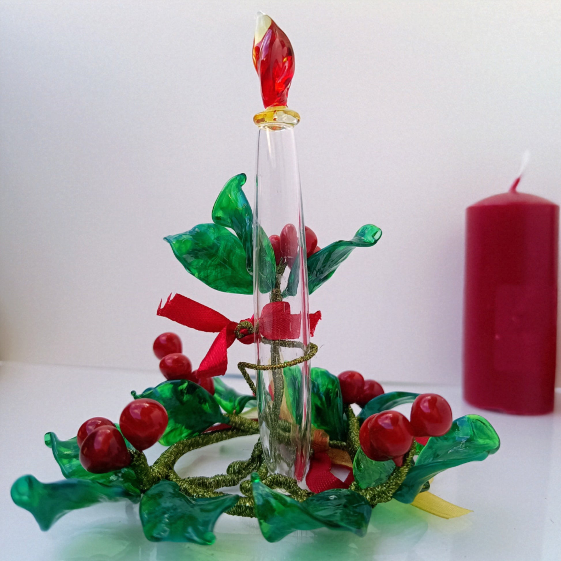 Questo bellissimo Centrotavola Agrifoglio con Candela in vetro soffiato è l'aggiunta perfetta alla tua tavola durante le feste. Realizzato a mano in vetro di Murano, il centrotavola presenta foglie in vetro verde smeraldo scuro elegantemente intrecciate che conferiscono una sensazione di classe e raffinatezza. Non solo è un regalo ideale ma anche una composizione unica e artistica che renderà la tua casa ancora più accogliente durante le festività.