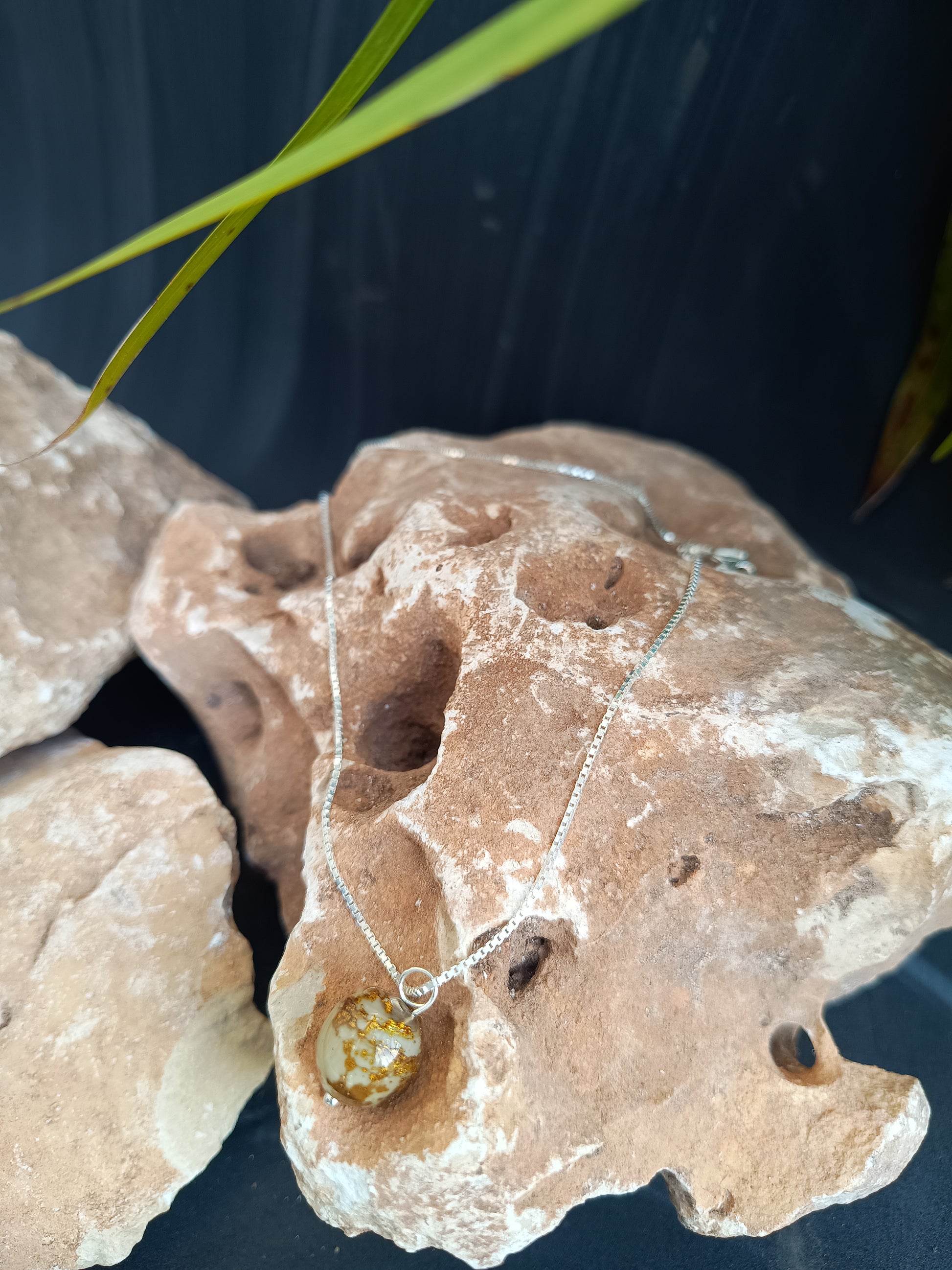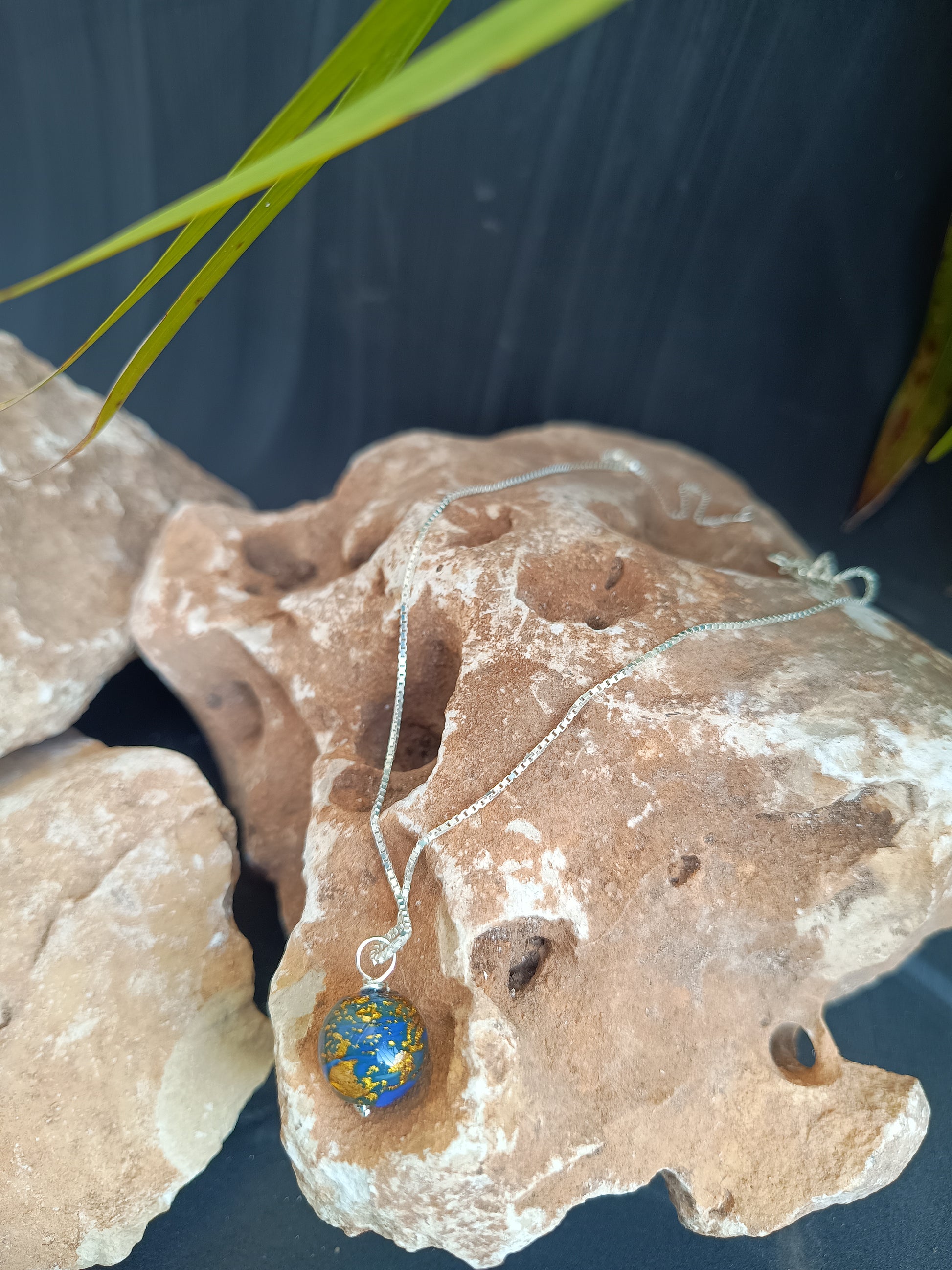 La perla planets è in vetro soffiato con scaglie in oro 24kt. La perla è realizzata con la lavorazione “vetro sommerso” questa particolare tecnica di lavorazione permette di conservare, inalterate nel tempo, le scaglie d’oro 24kt mantenendole per sempre rinchiuse nella perla.