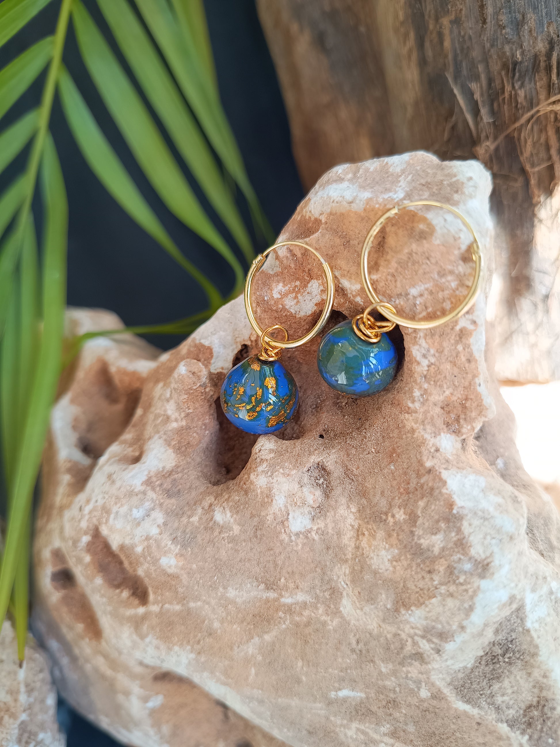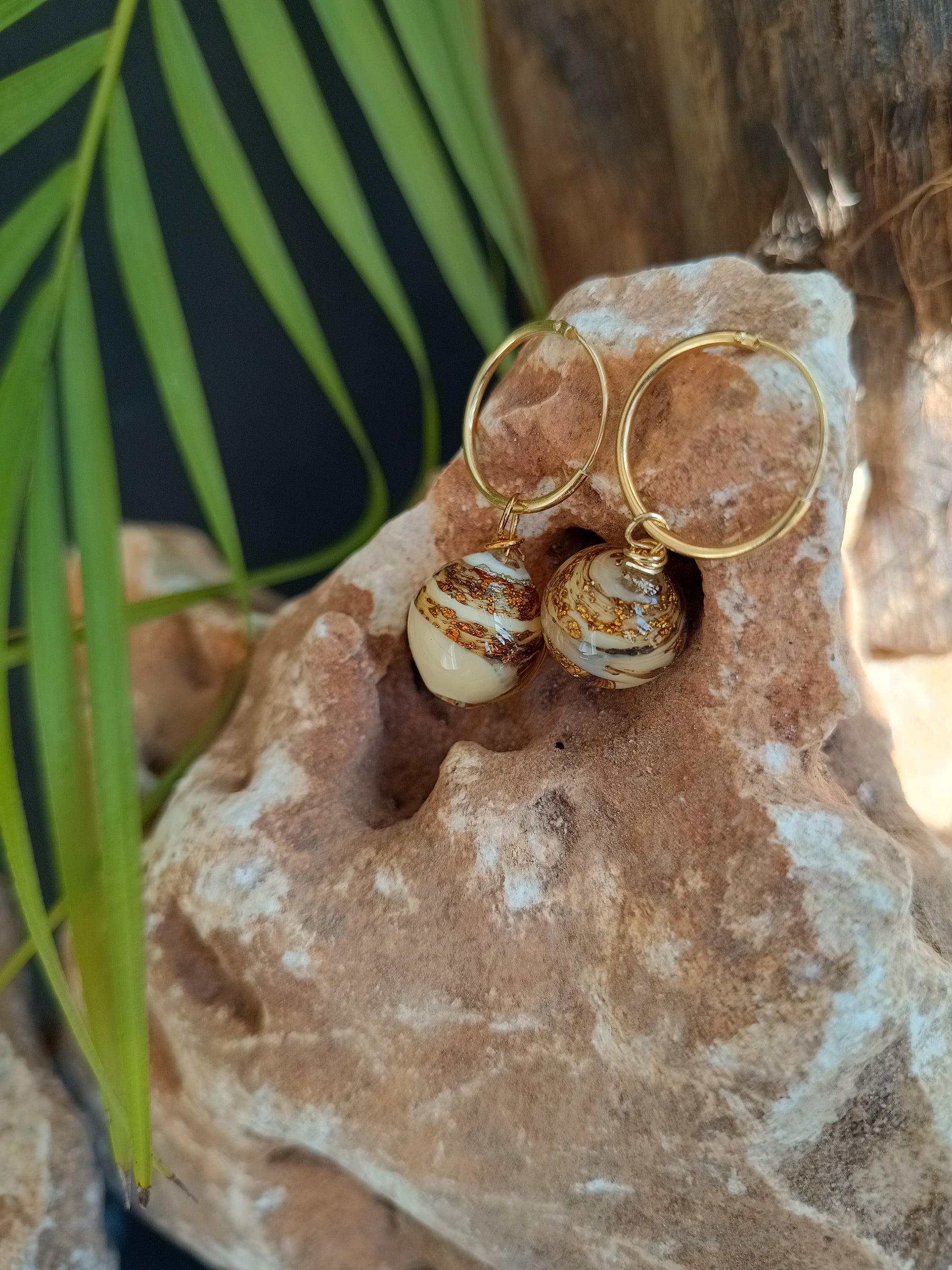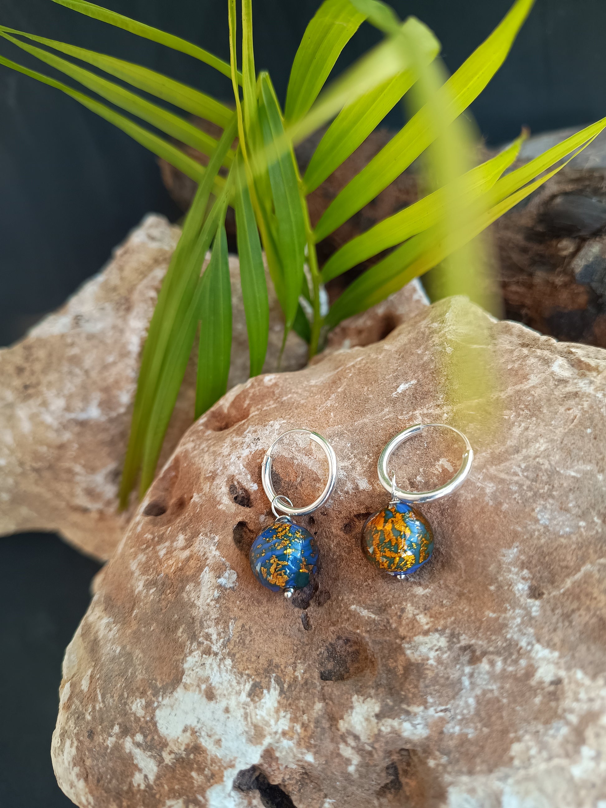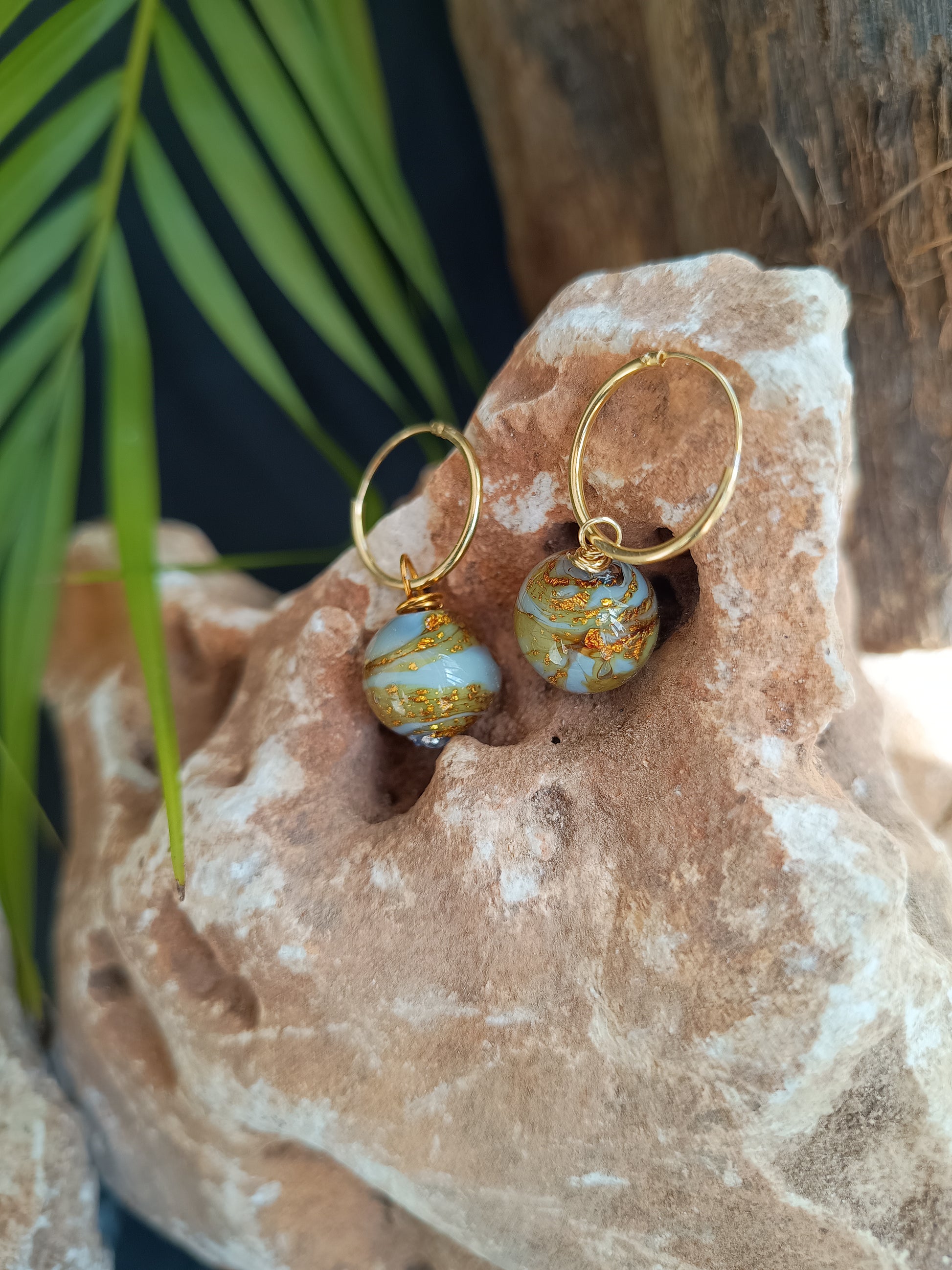 La perla planets è in vetro soffiato con scaglie in oro 24kt. La perla è realizzata con la lavorazione “vetro sommerso” questa particolare tecnica di lavorazione permette di conservare, inalterate nel tempo, le scaglie d’oro 24kt mantenendole per sempre rinchiuse nella perla.