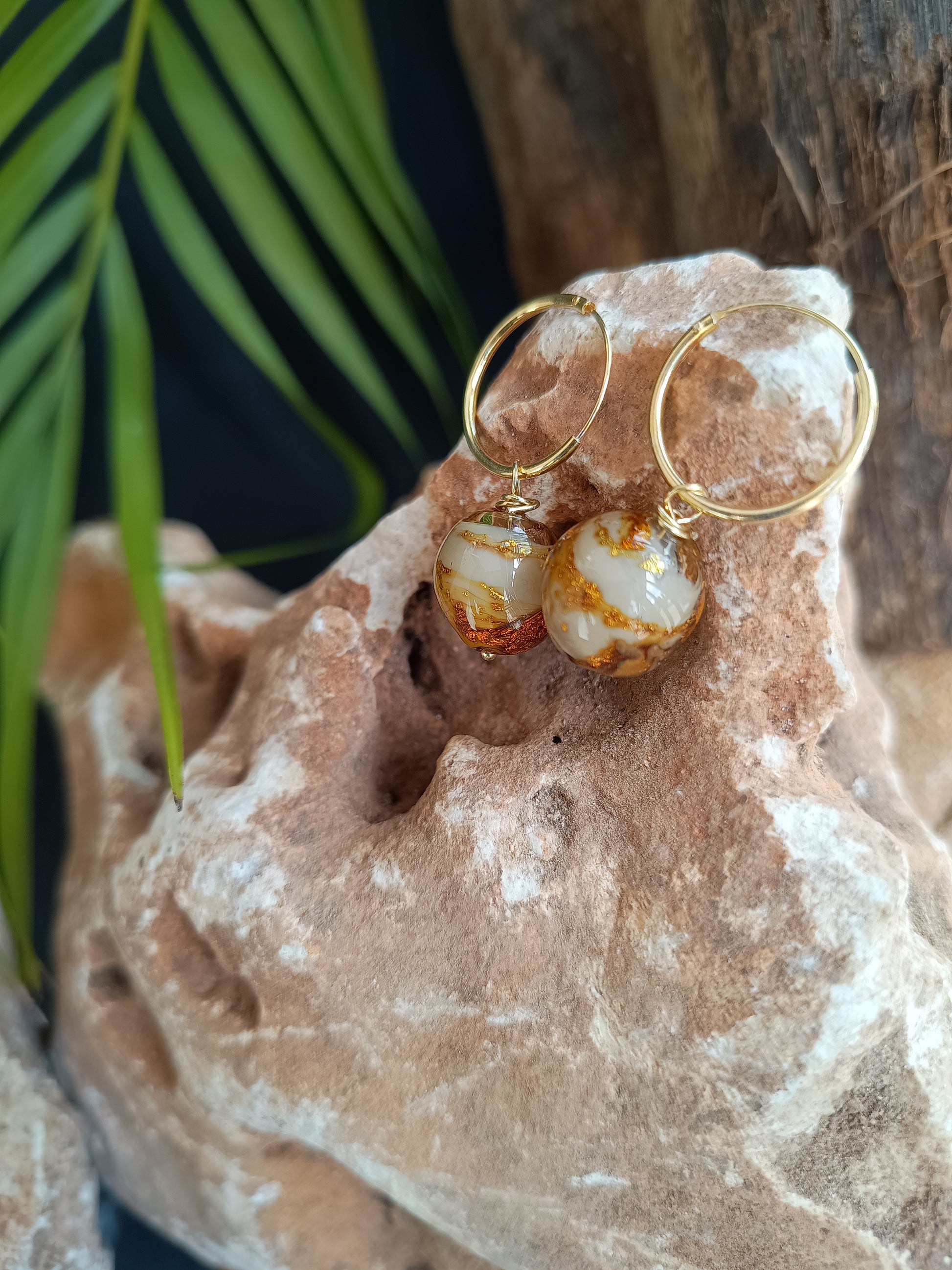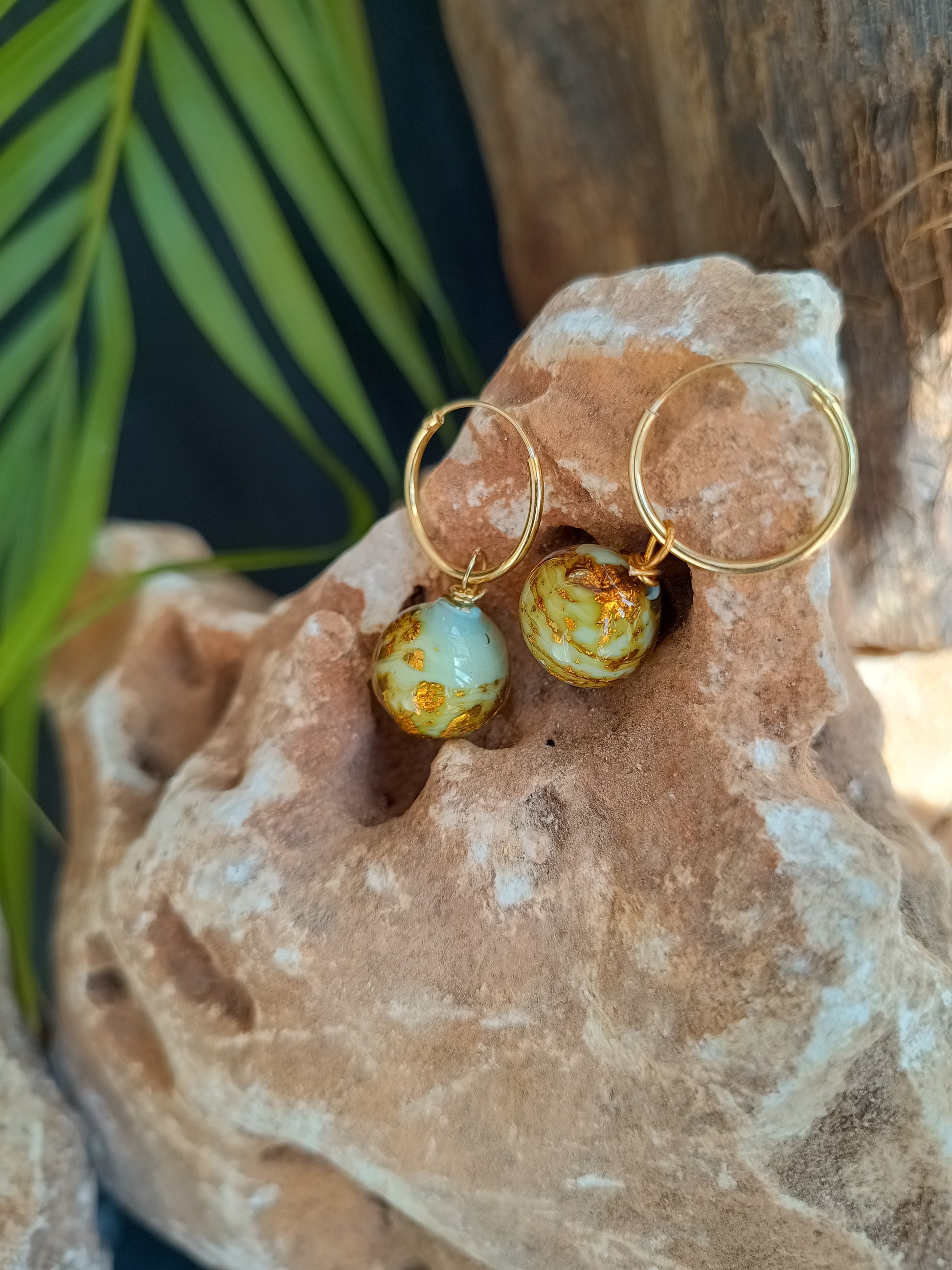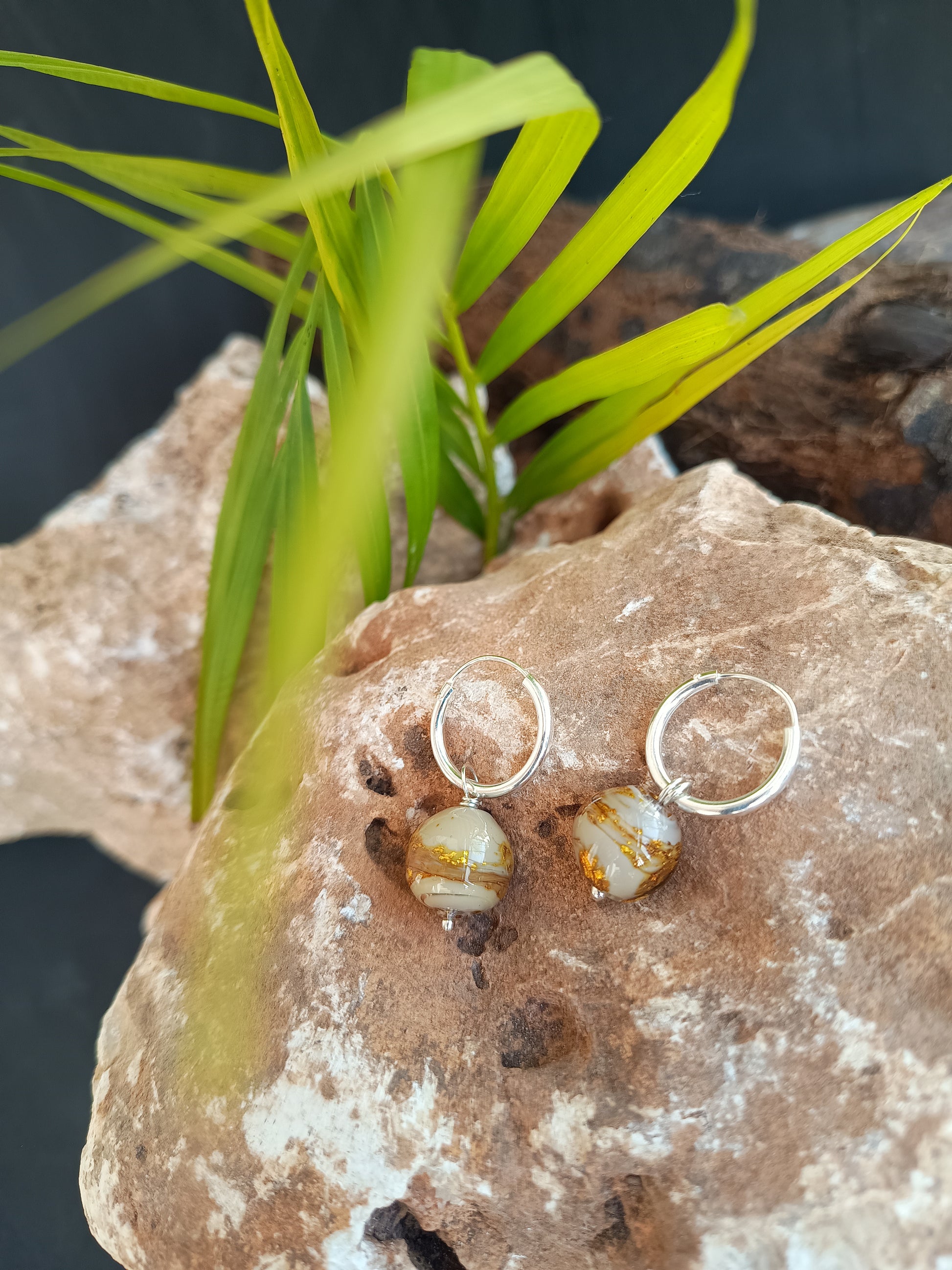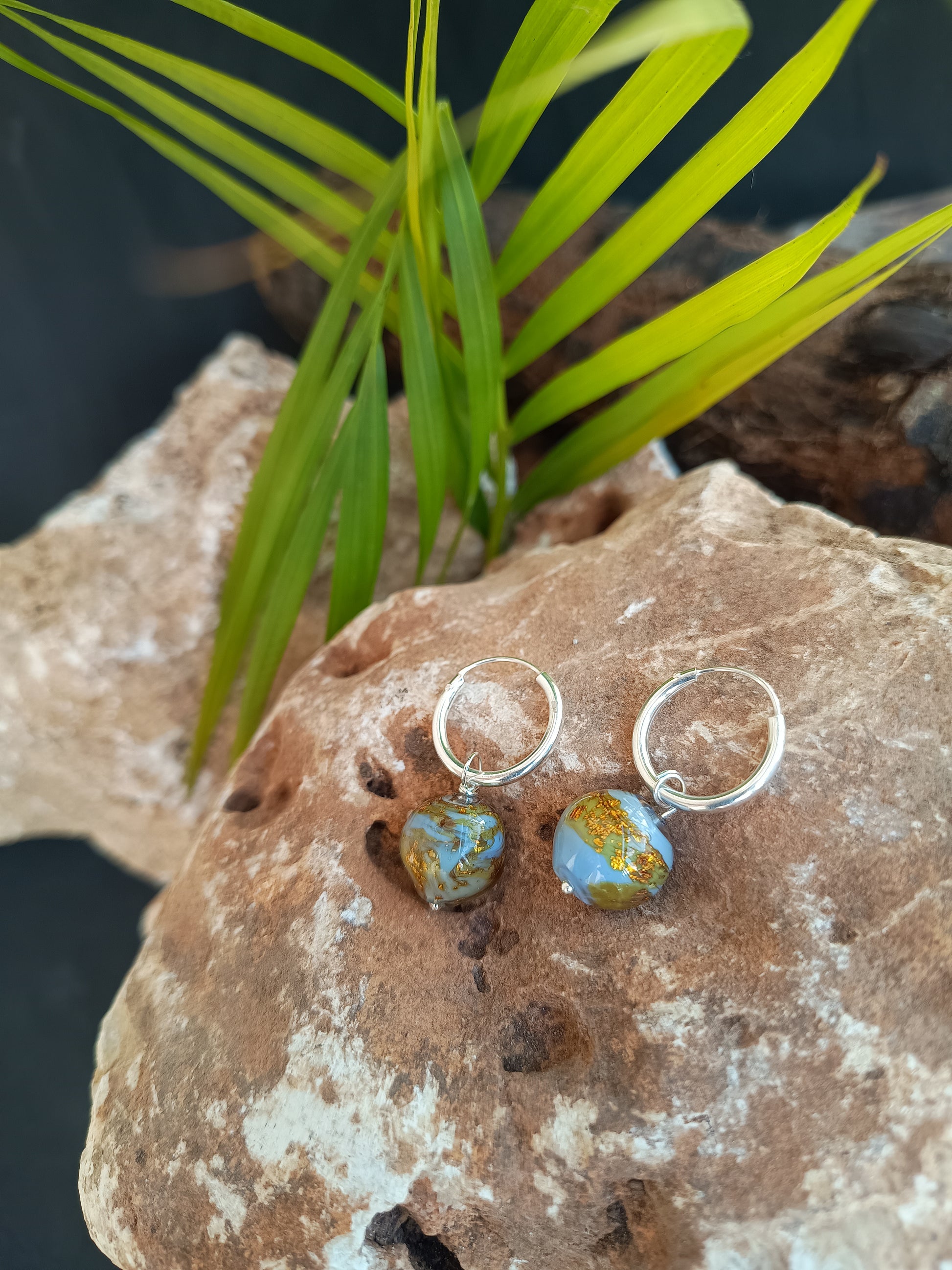 La perla planets è in vetro soffiato con scaglie in oro 24kt. La perla è realizzata con la lavorazione “vetro sommerso” questa particolare tecnica di lavorazione permette di conservare, inalterate nel tempo, le scaglie d’oro 24kt mantenendole per sempre rinchiuse nella perla.