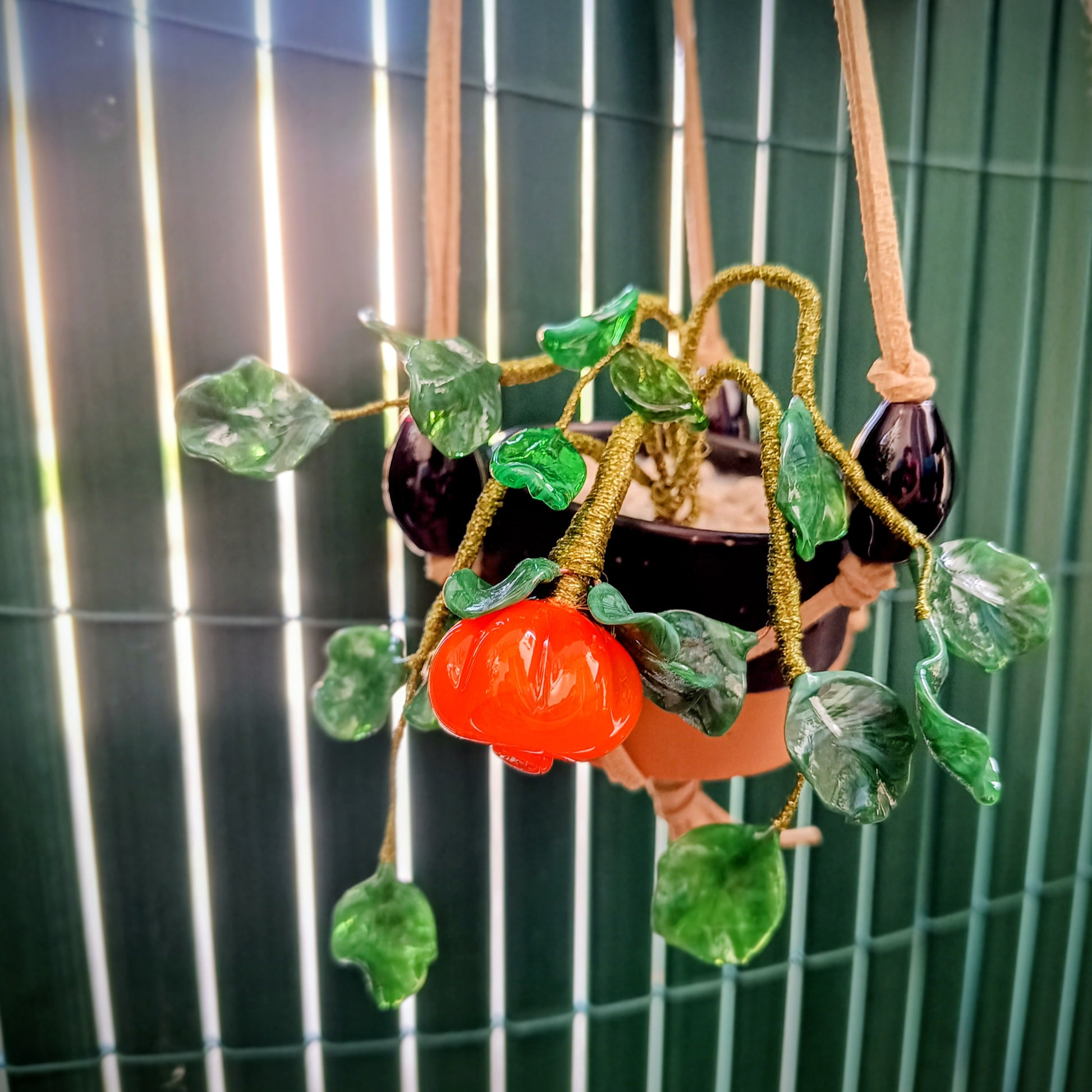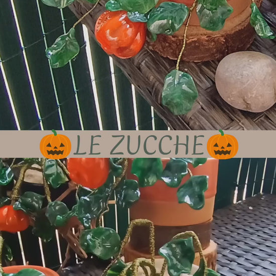 Questa piantina di zucca in vetro di Murano è un regalo perfetto per abbellire qualsiasi ambiente. La zucca arancione e le foglioline in vetro sono assemblate con filo di lurex verde scuro, donando un tocco di eleganza. Ideale per la tua casa o ufficio, può essere appesa o appoggiata per un'atmosfera unica e raffinata.