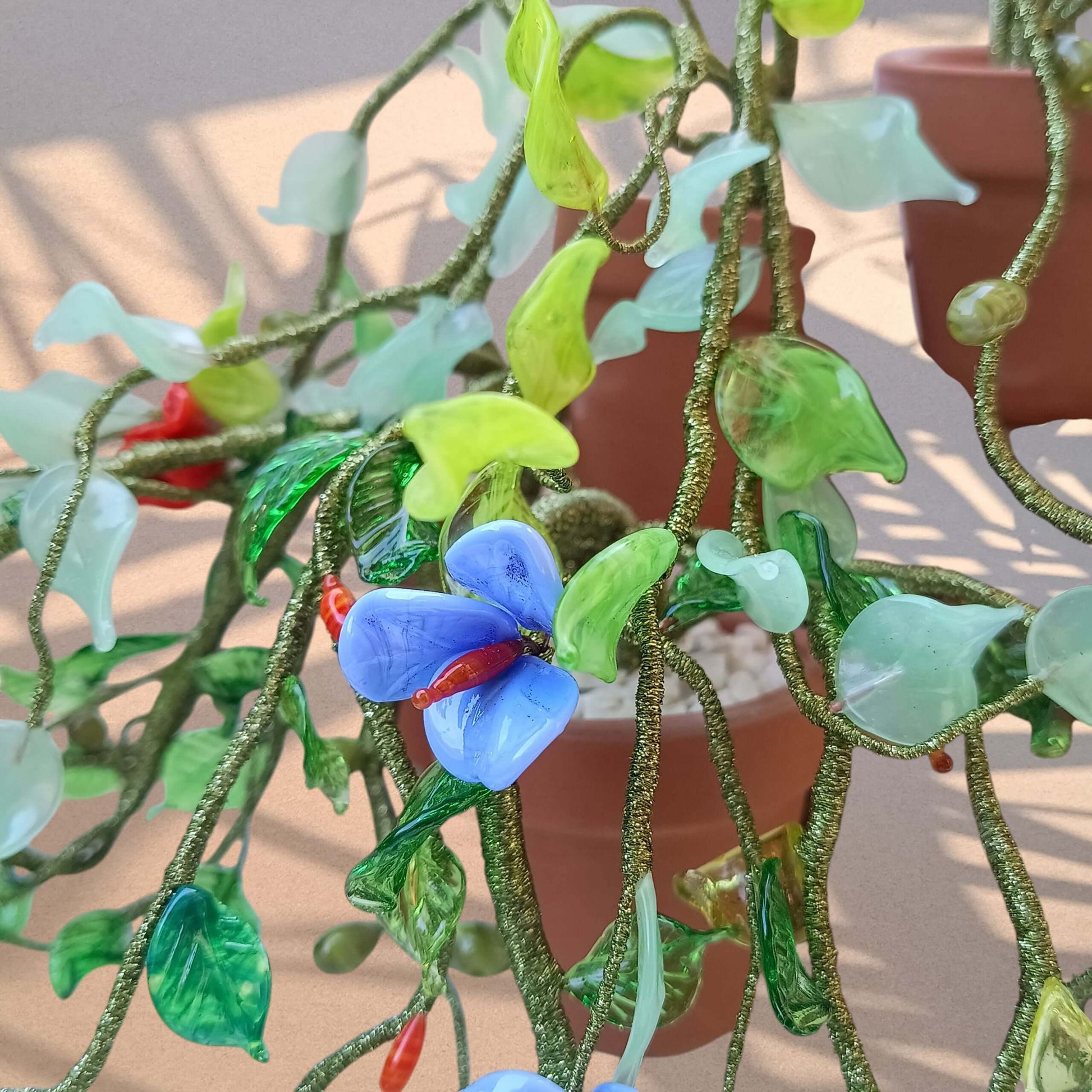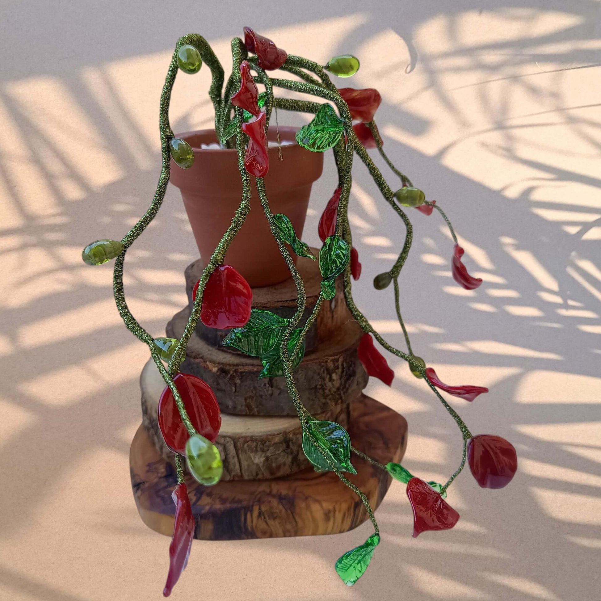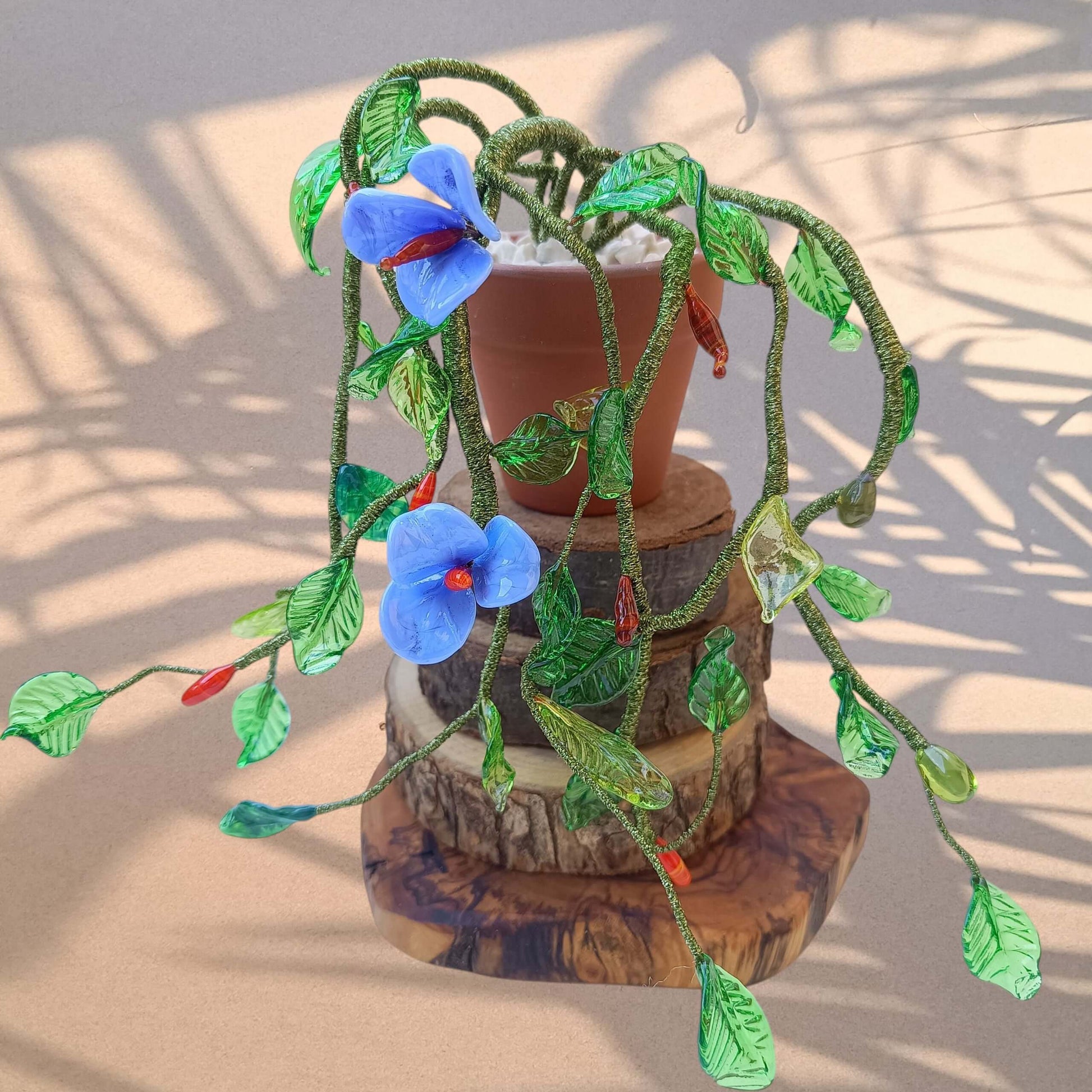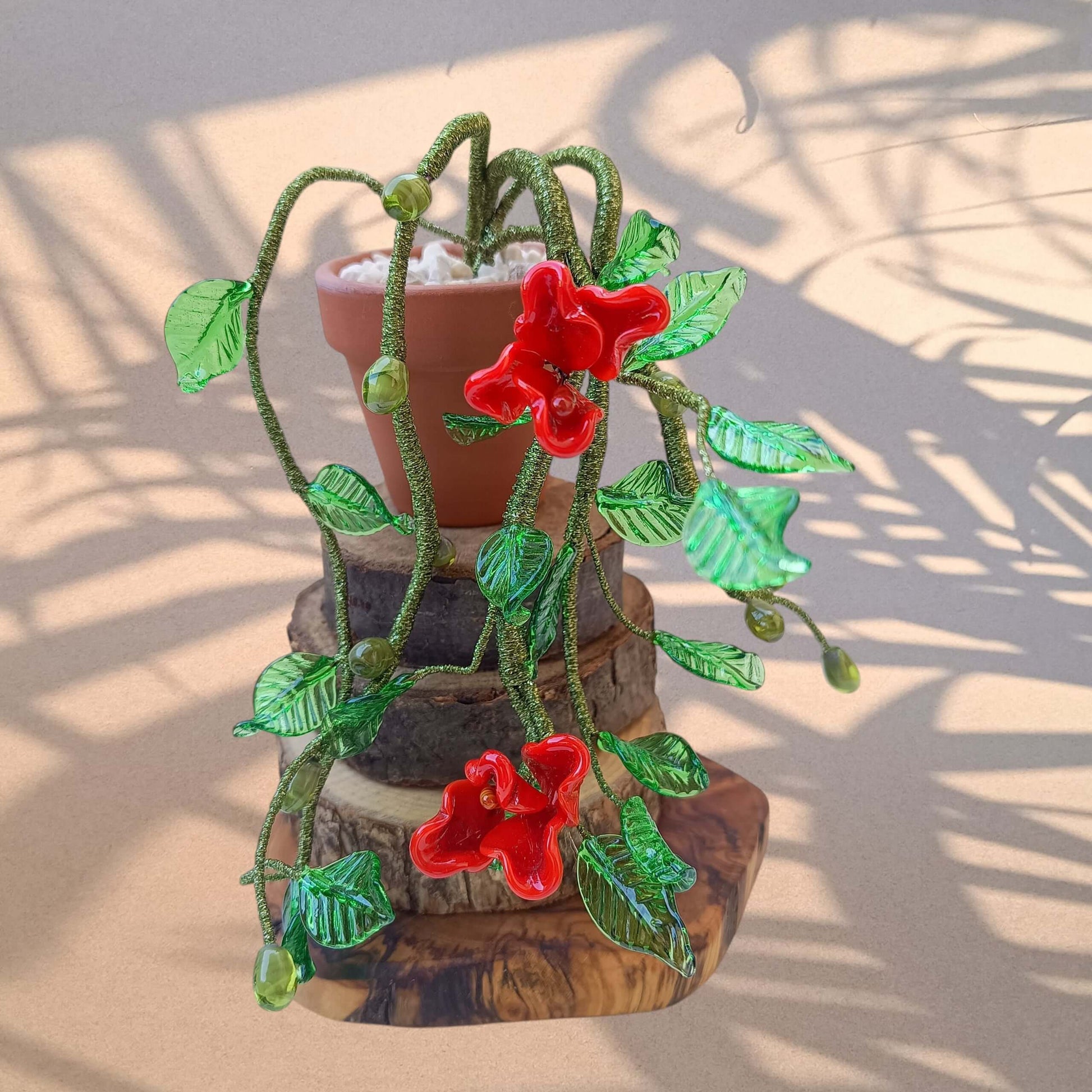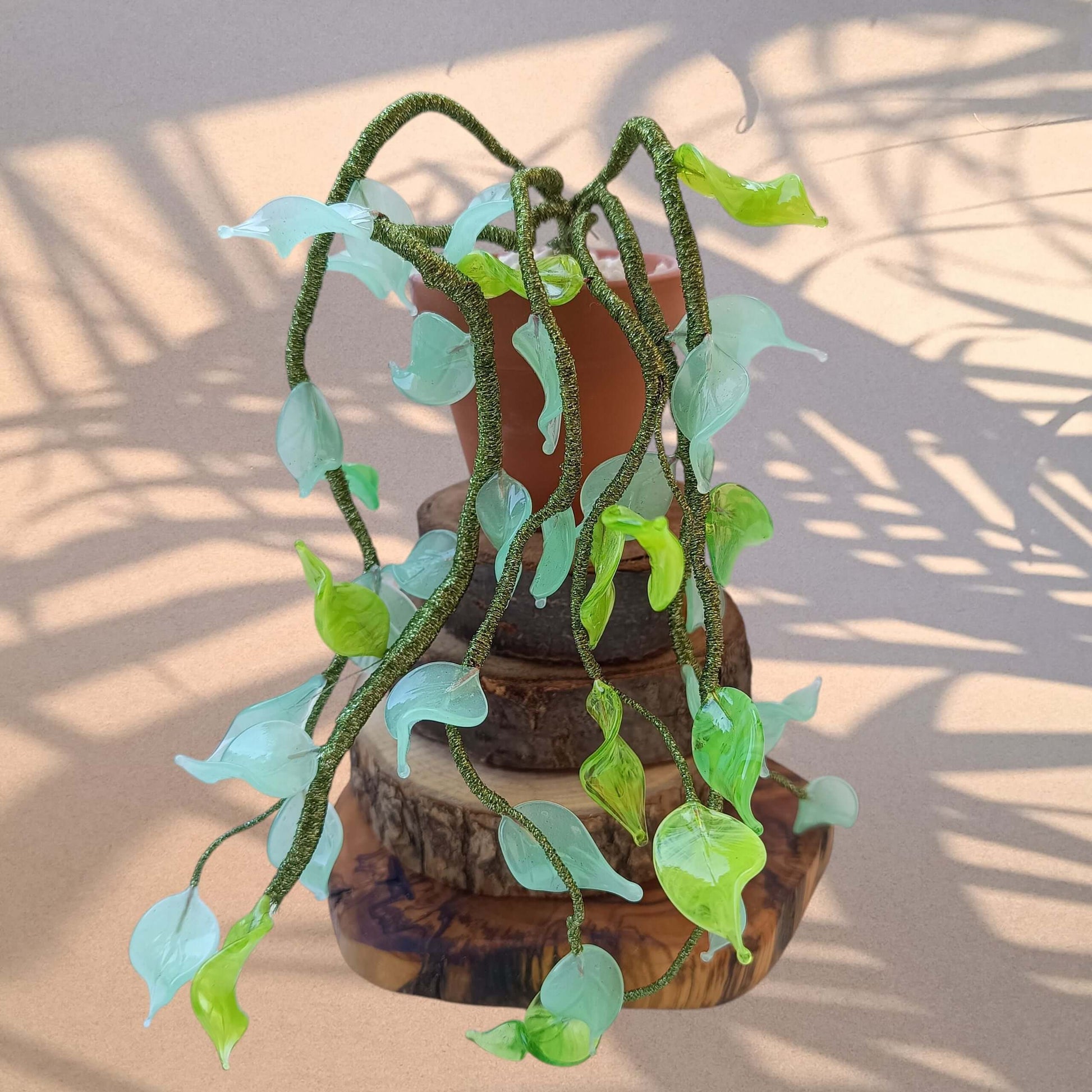 Esalta la bellezza della tua casa con le nostre piantine pendenti in vetro di Murano. Perfette per decorare le pareti e appendere in modo creativo, sono adornate con graziosi fiorellini e foglioline. Il filo di lurex verde aggiunge un tocco di eleganza, mentre il vasetto in terracotta ne completa lo stile.