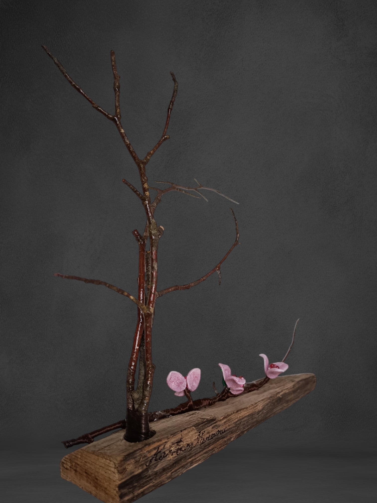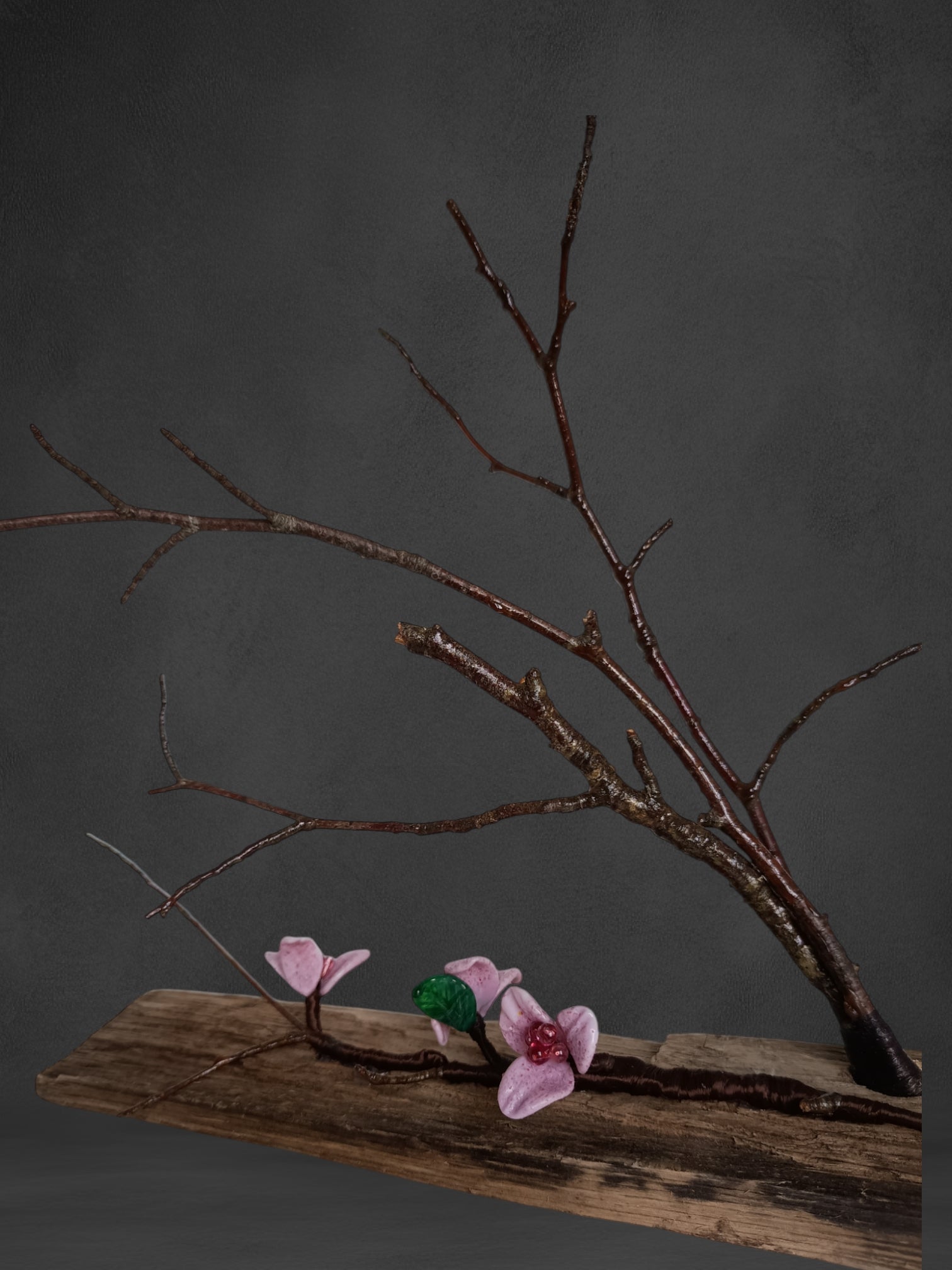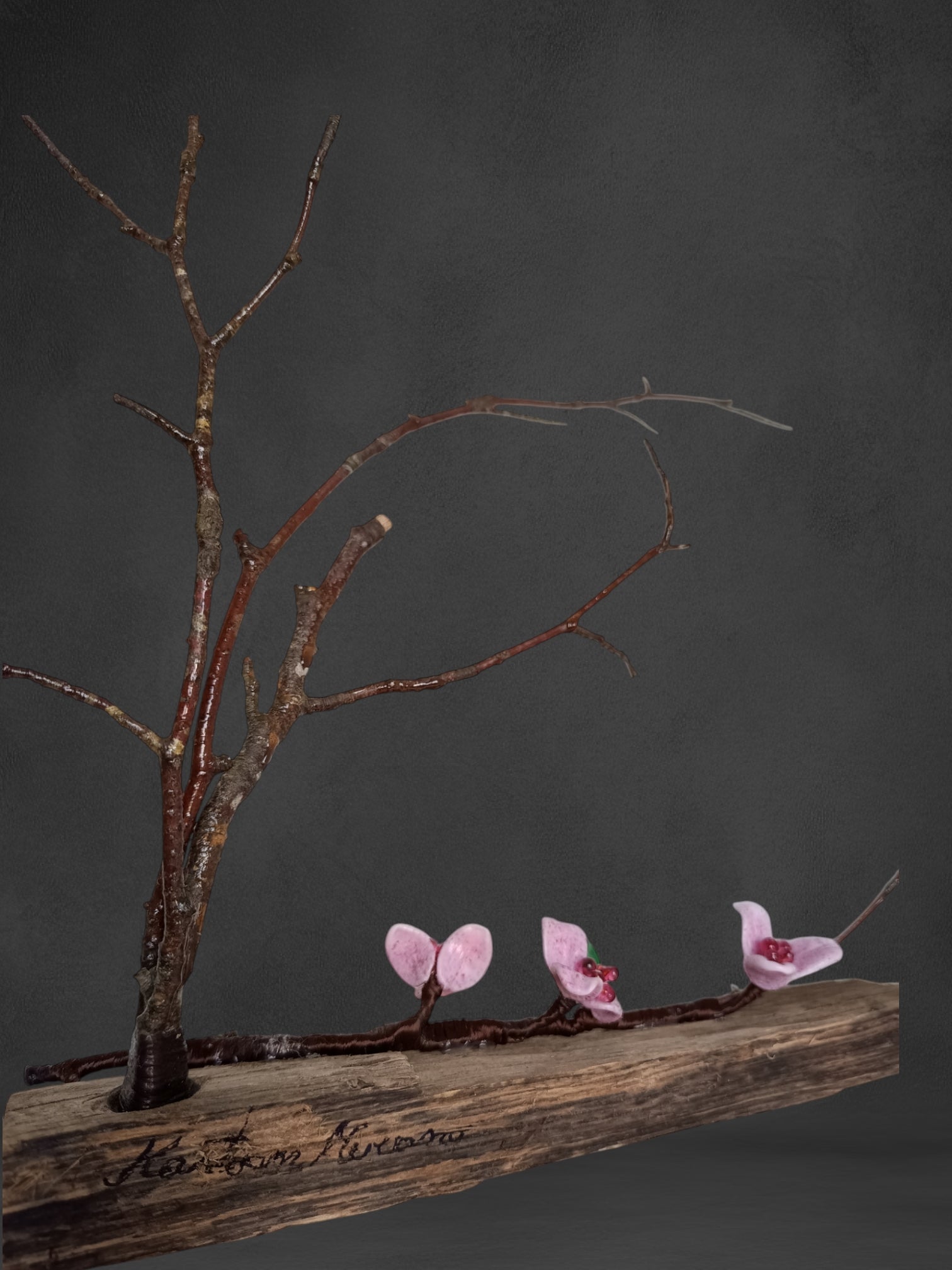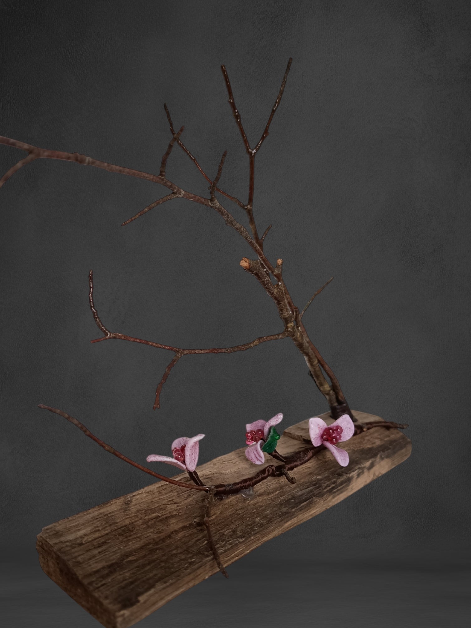 La scultura presenta una base e un ramo in legno di faggio su cui riposano tre splendidi fiori di pesco in vetro, realizzati a Murano nel nostro laboratorio, utilizzando la tecnica del vetro a lume.