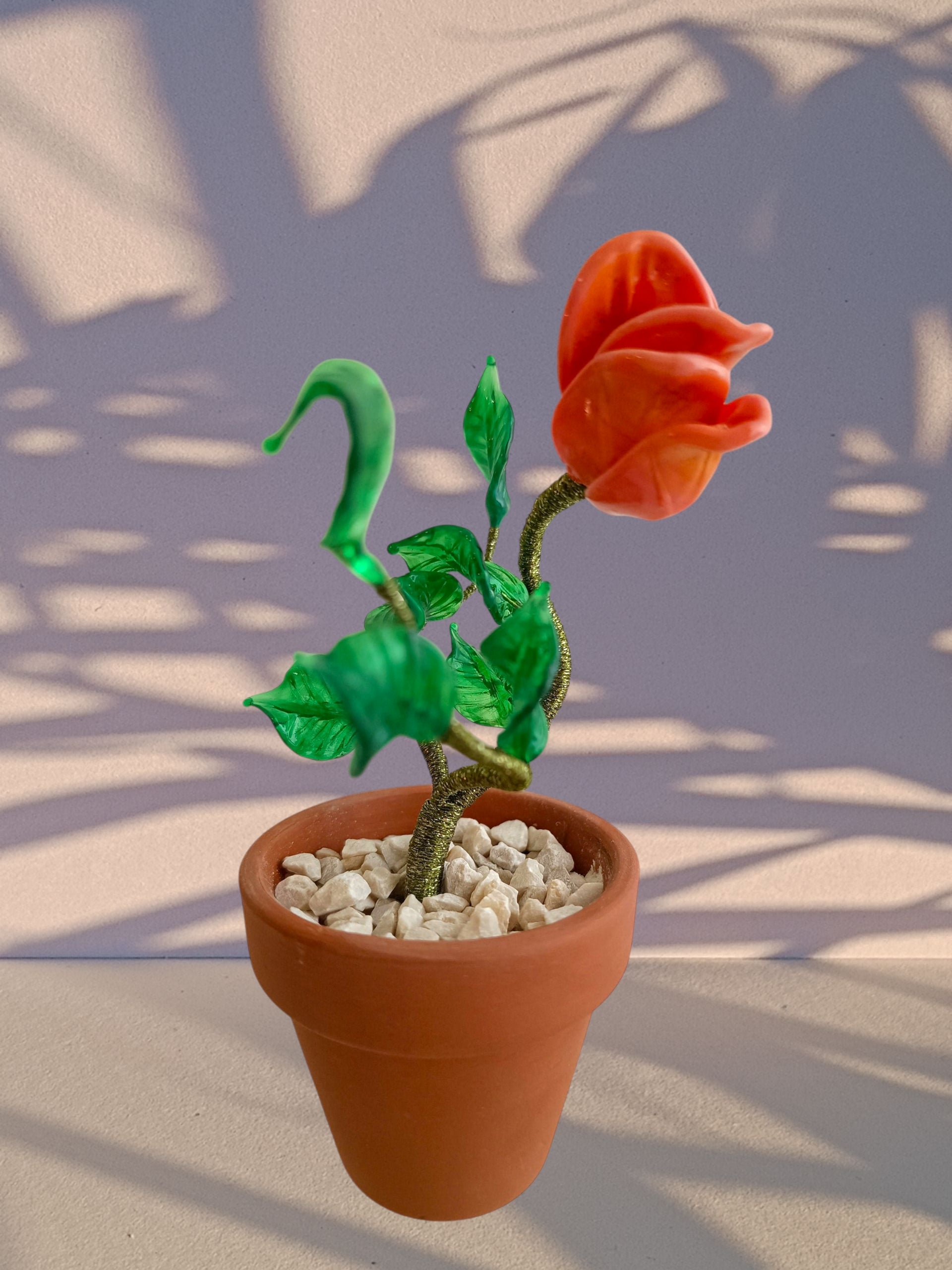 Porta a casa un pezzo di giardino con la nostra pianta di rosa ! La delicata rosellina in vetro aggiungerà un tocco di eleganza,mentre il filo di seta la rende ancora più realistica. Confezionata in un grazioso vasetto di terracotta, questa pianta porterà allegria e bellezza nella tua casa.